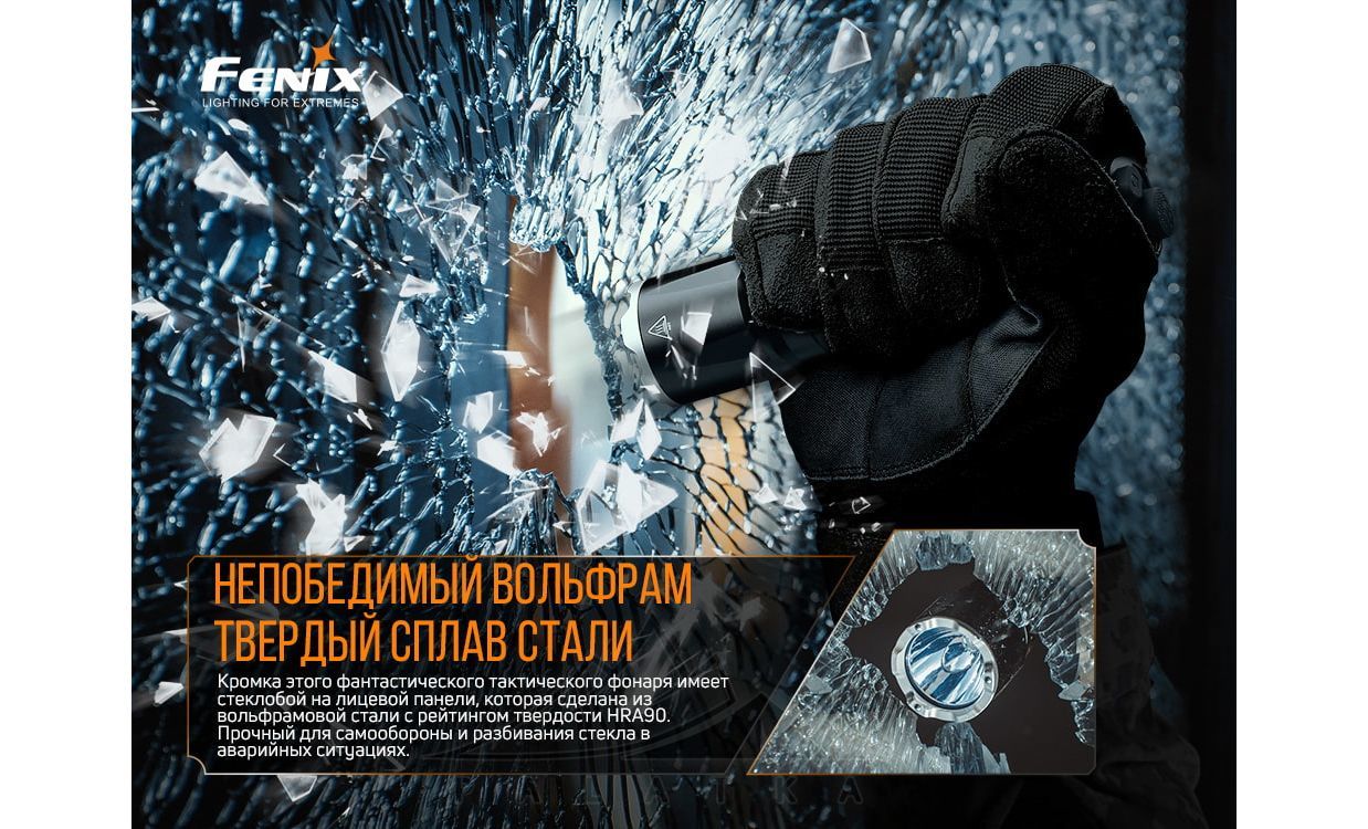 - Голова корпусу ліхтаря виготовлена із твердого сплаву вольфрамової сталі з жорсткістю HRA-90, що дозволяє розбити скло при аварійній ситуації.