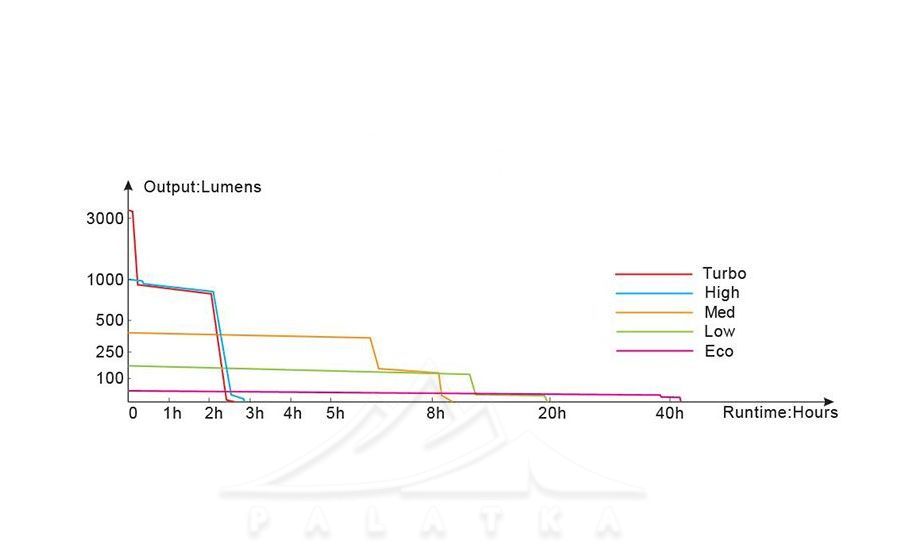 - Eco: яскравість - 30 lm, час роботи - 43 г 20 хв, дальність - 40 м