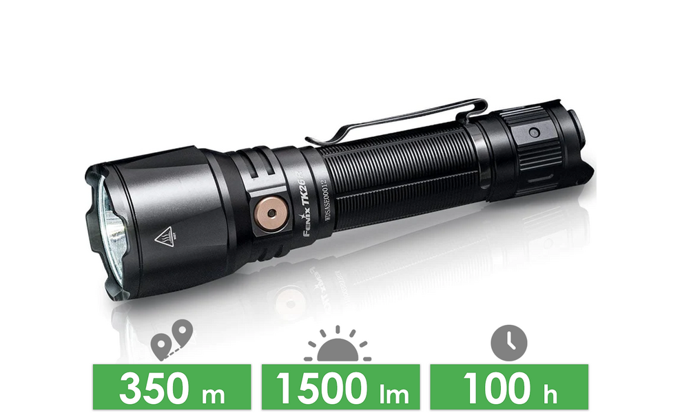 Ліхтар ручний Fenix TK26R — перезаряджаємий тактичний ліхтар з високою яскравістю, зеленим та червоним світлом. Може використовуватись у тактичних, туристичних, мисливських цілях, мисливцям, а також для здійснення пошукових робіт.