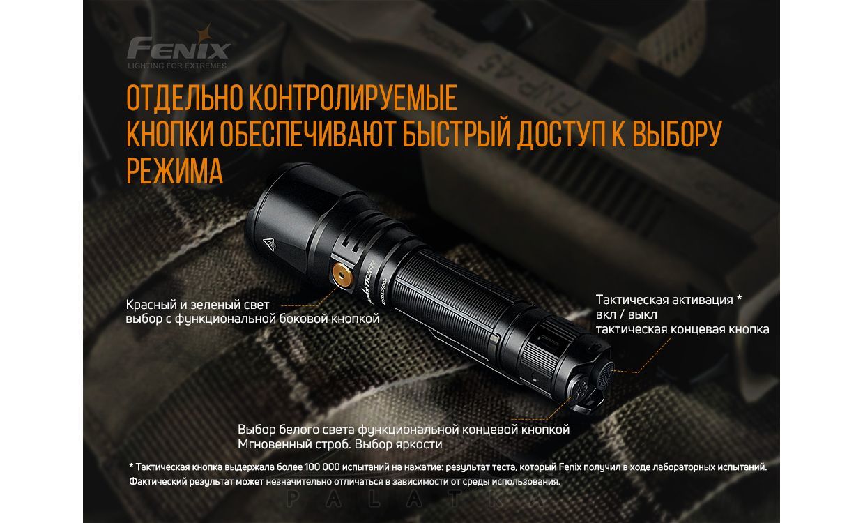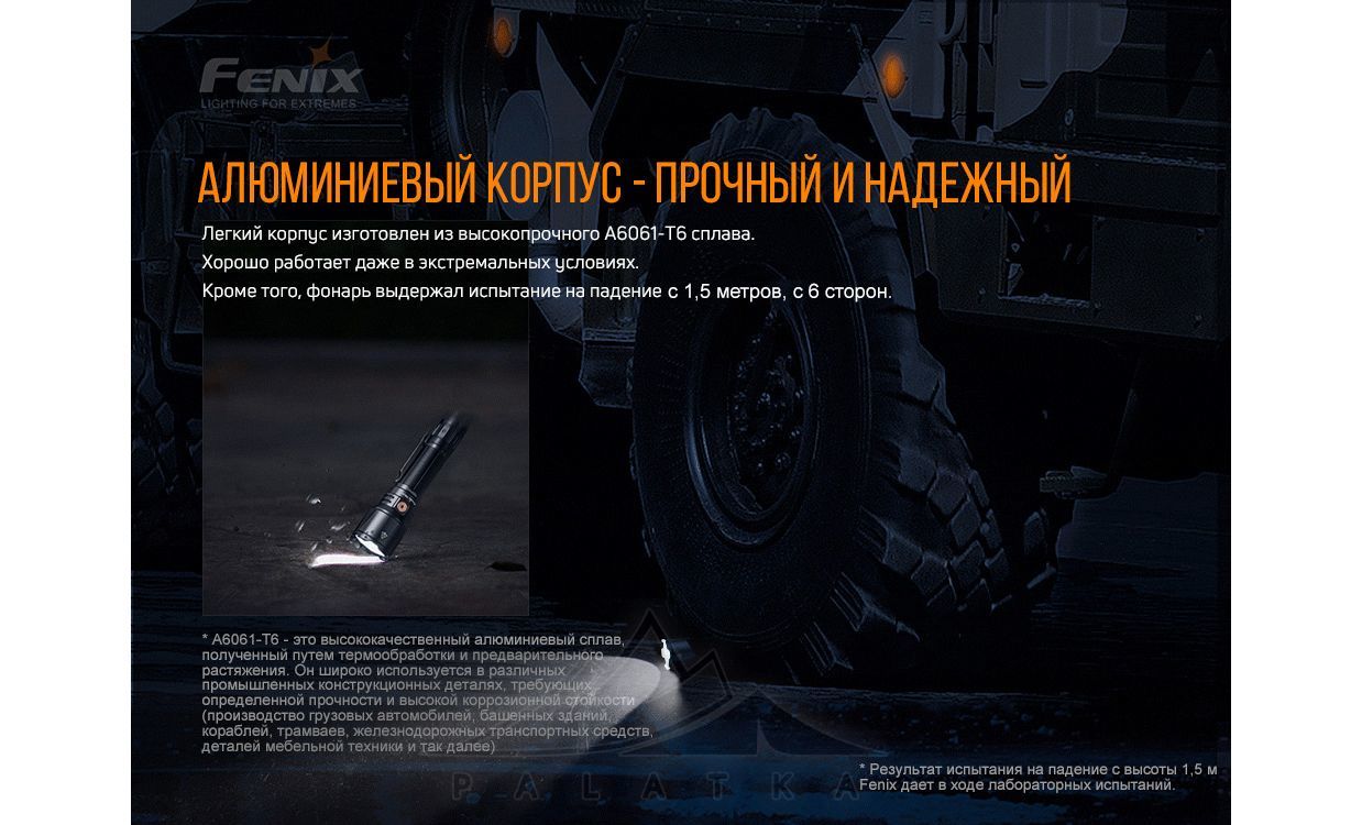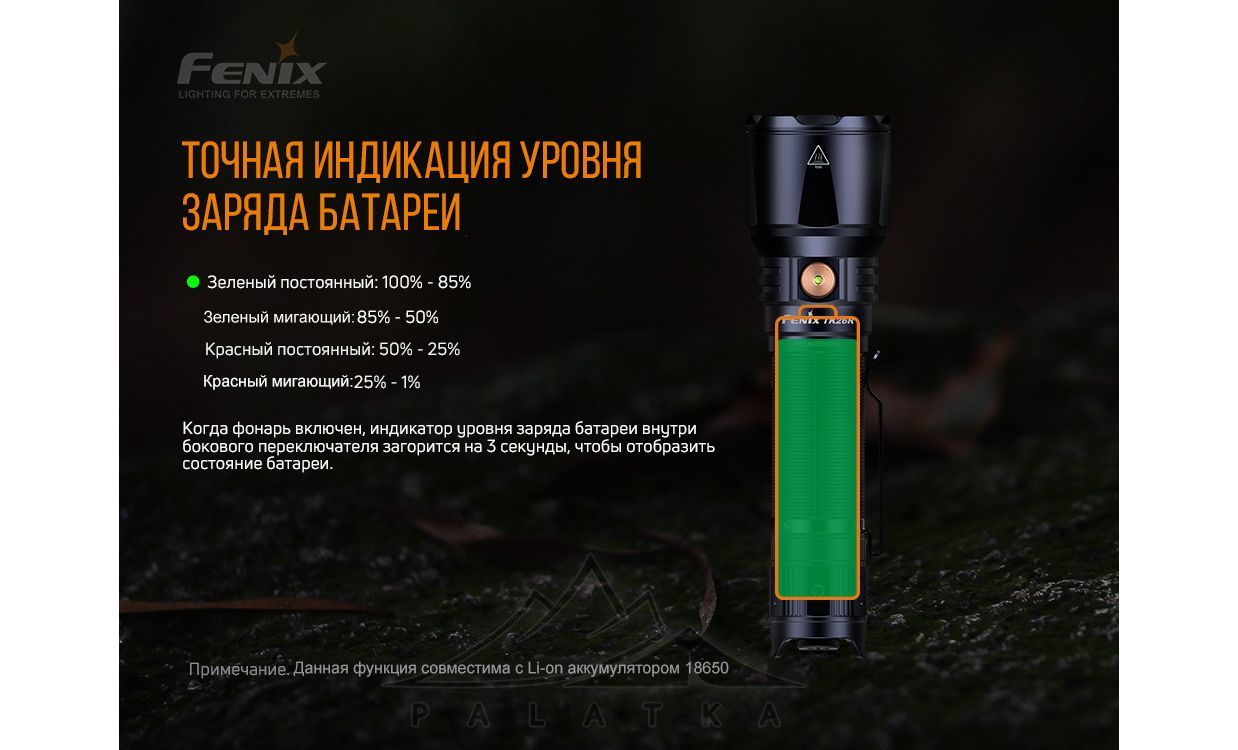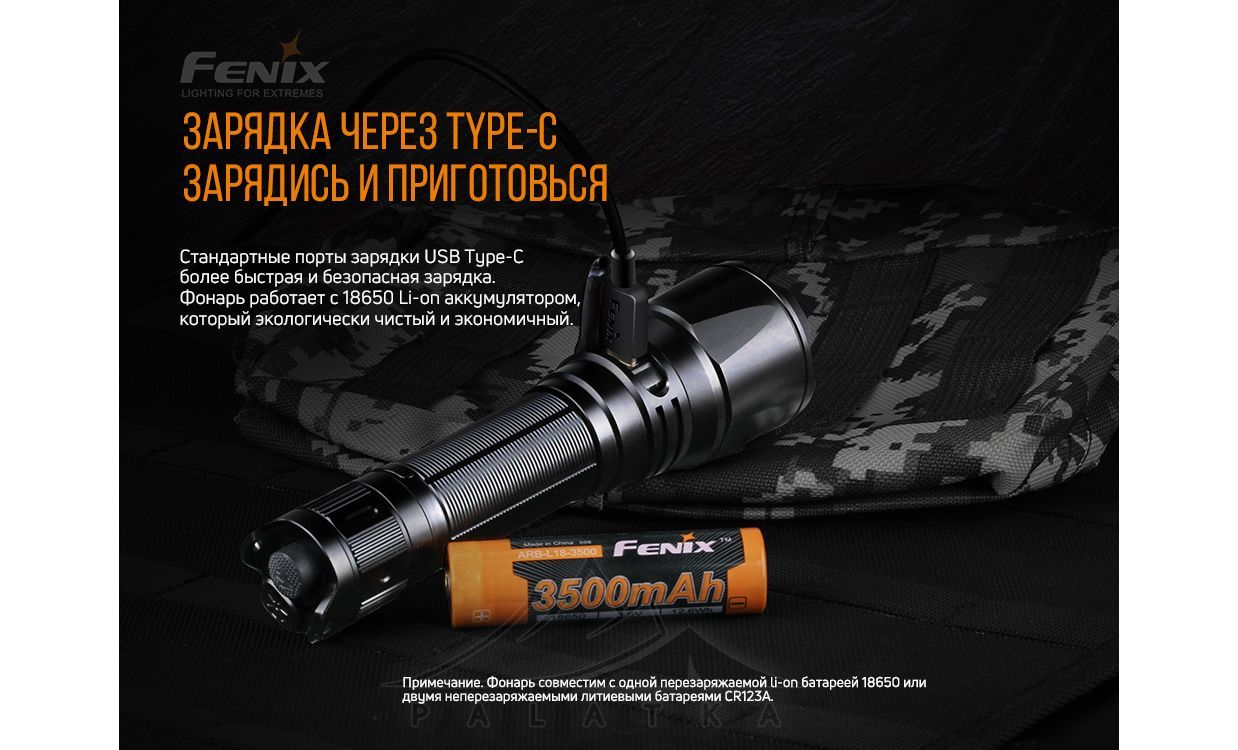 - Живлення від одного акумулятору типу 18650 (акумулятор Fenix ARB-L18-3400 входить у комплект) або від двох батарейок CR123A (не входять у комплект).