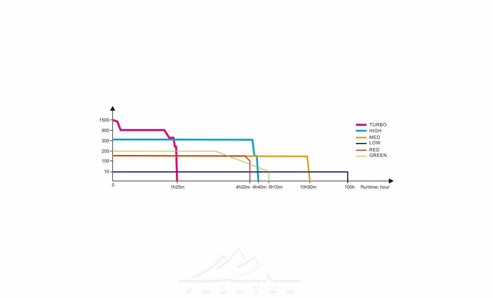 - Turbo: яcкравість - 1500 lm, час роботи - 1 г 25 хв, дальність - 350 м