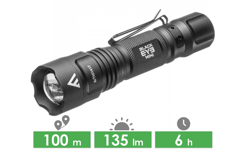 Mactronic Black Eye Mini Focus — найкомпактніший тактичний міні-ліхтар з серії Black Eye, оснащений висувною лінзою. Призначений для тактичних завдань, туризму, кемпінгу, або повсякденного використання.