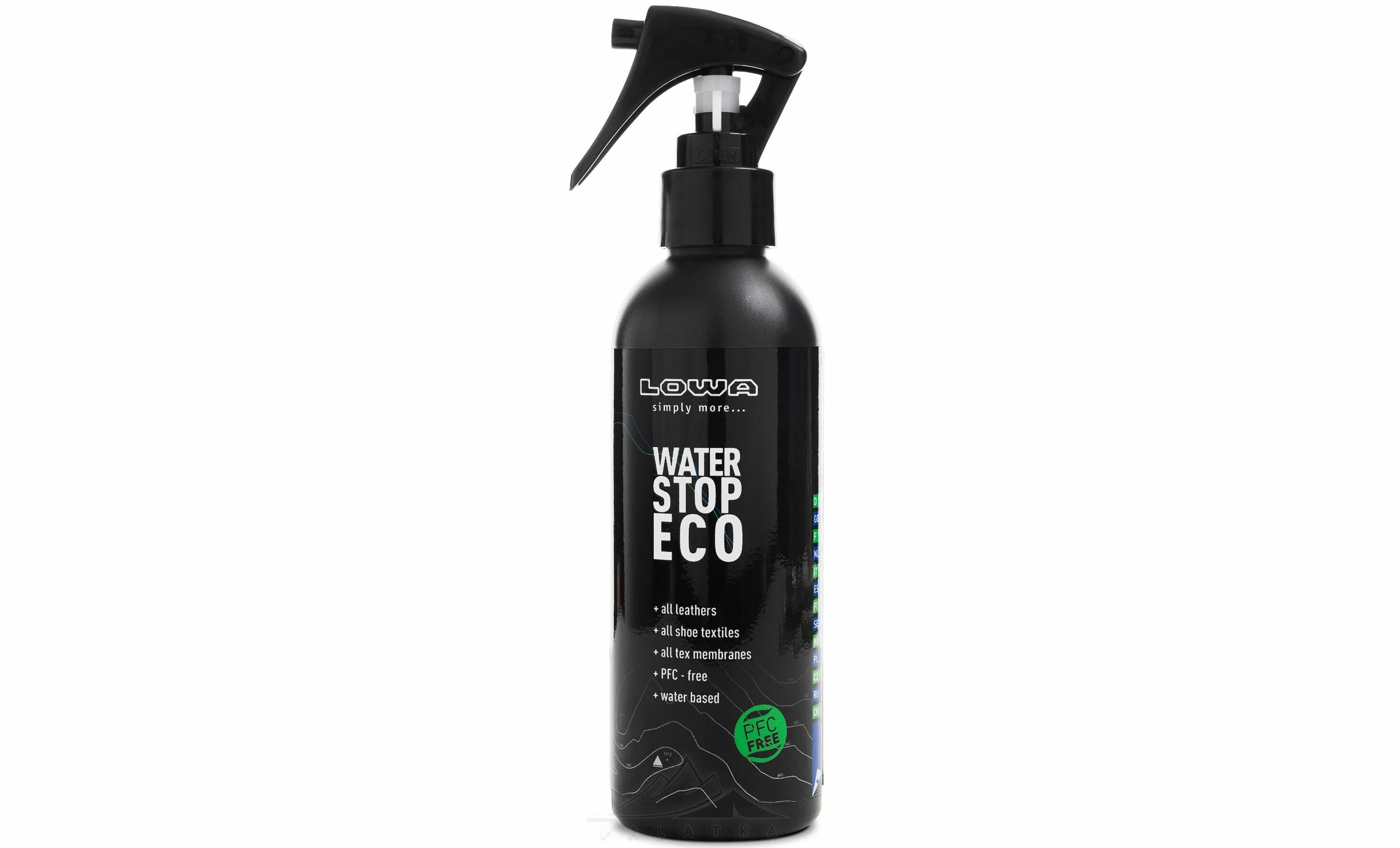 LOWA Water Stop Eco — високоефективний спрей на водній основі для відновлення водовідштовхувальних властивостей взуття та захисту від вологи й бруду, зберігаючи при цьому повітропроникність матеріалів.