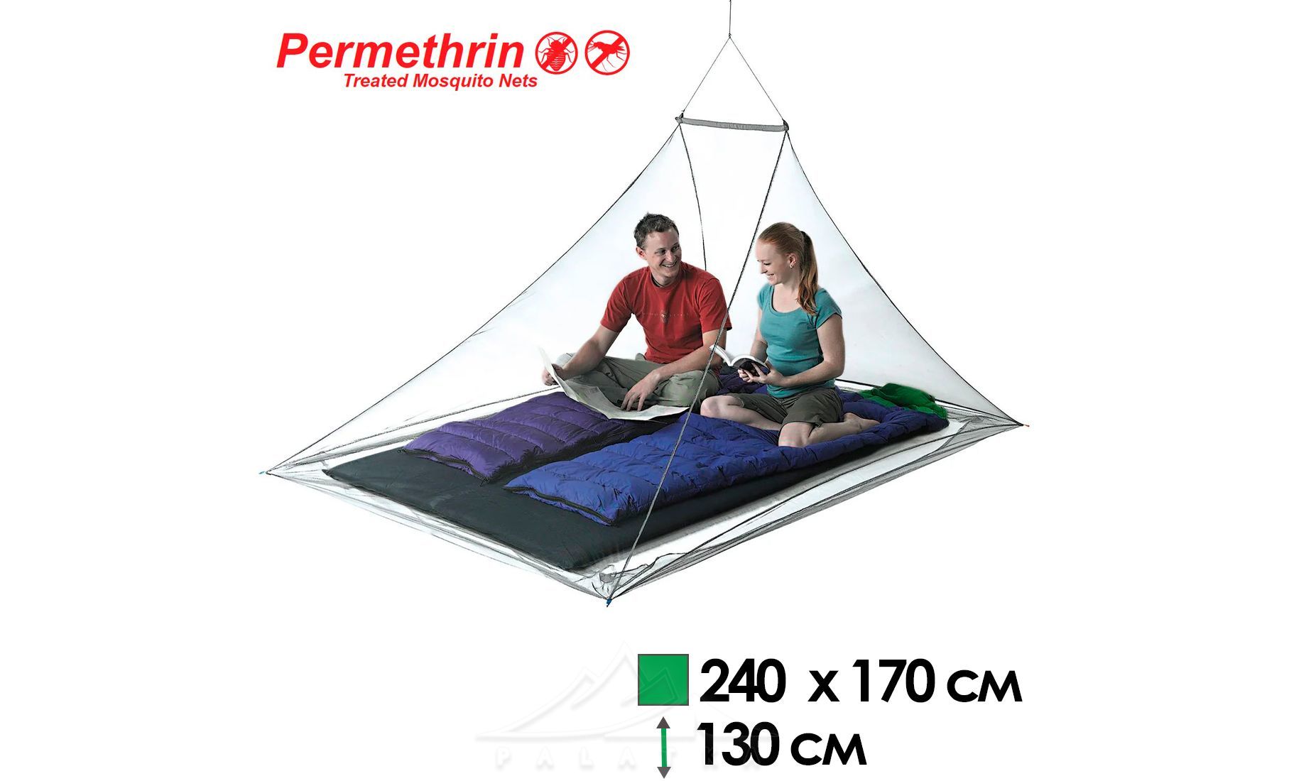 Москітна сітка Sea to Summit Mosquito Pyramid Nano Permethrin — сітка у формі піраміди з асиметричною точкою підвісу, розрахована на два спальних місця, з обробкою Insect Shield® для додаткового захисту від комарів. Стане в нагоді як вдома, так і в поході для захисту спального місця від проникнення комах, що кусають.