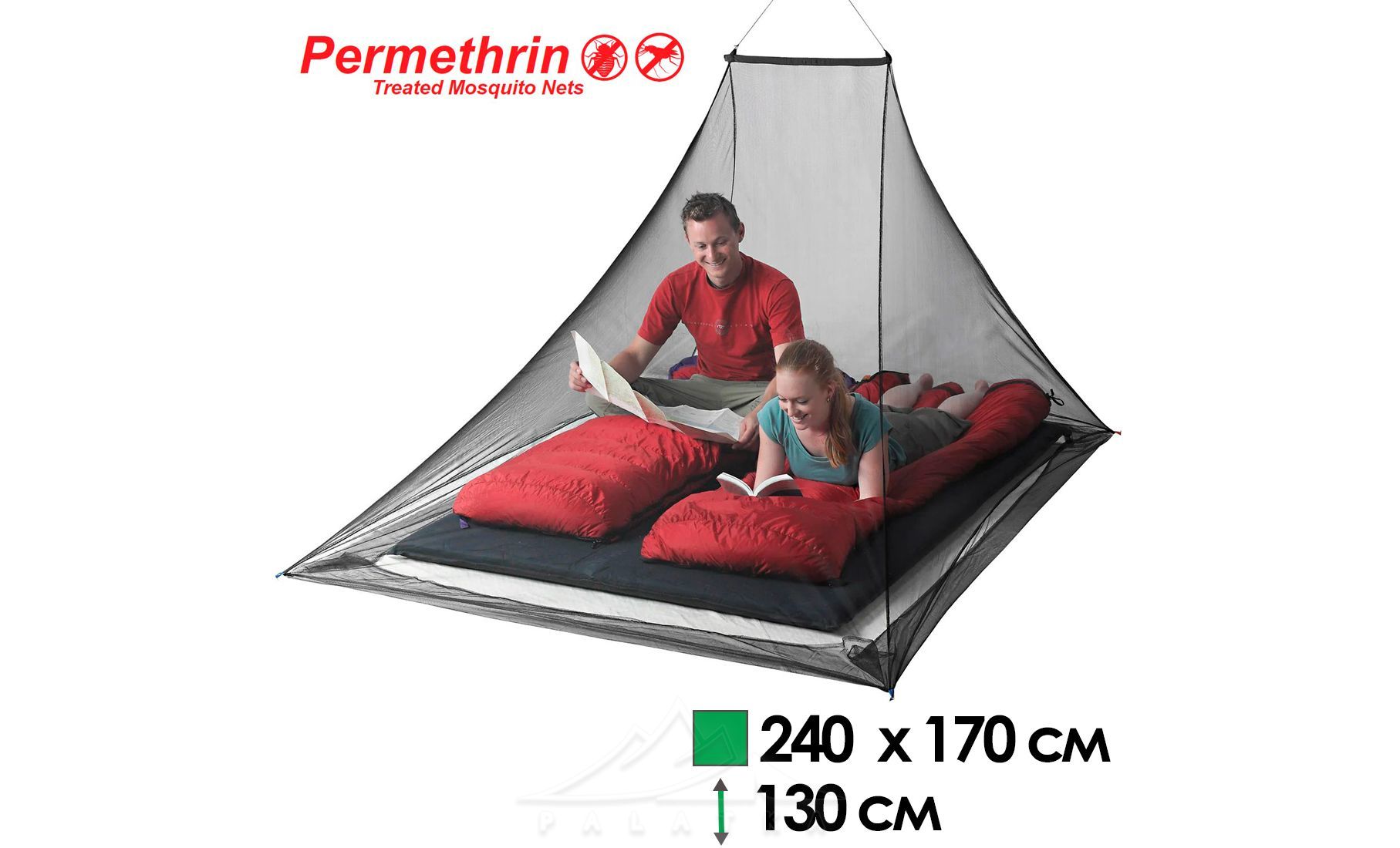 Москітна сітка Sea to Summit Mosquito Pyramid Permethrin — сітка у формі піраміди з асиметричною точкою підвісу, розрахована на два спальних місця, з обробкою Insect Shield® для додаткового захисту від комарів. Стане в нагоді як вдома, так і в поході для захисту спального місця від проникнення комах, що кусають.