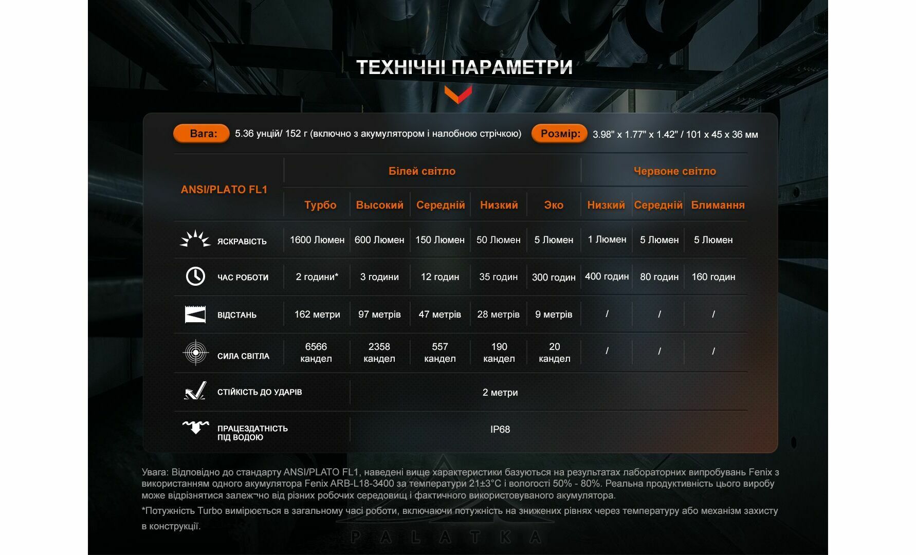 - Максимальна яскравість 1600 люмен — потужний запас світла для руху, роботи та складних умов.