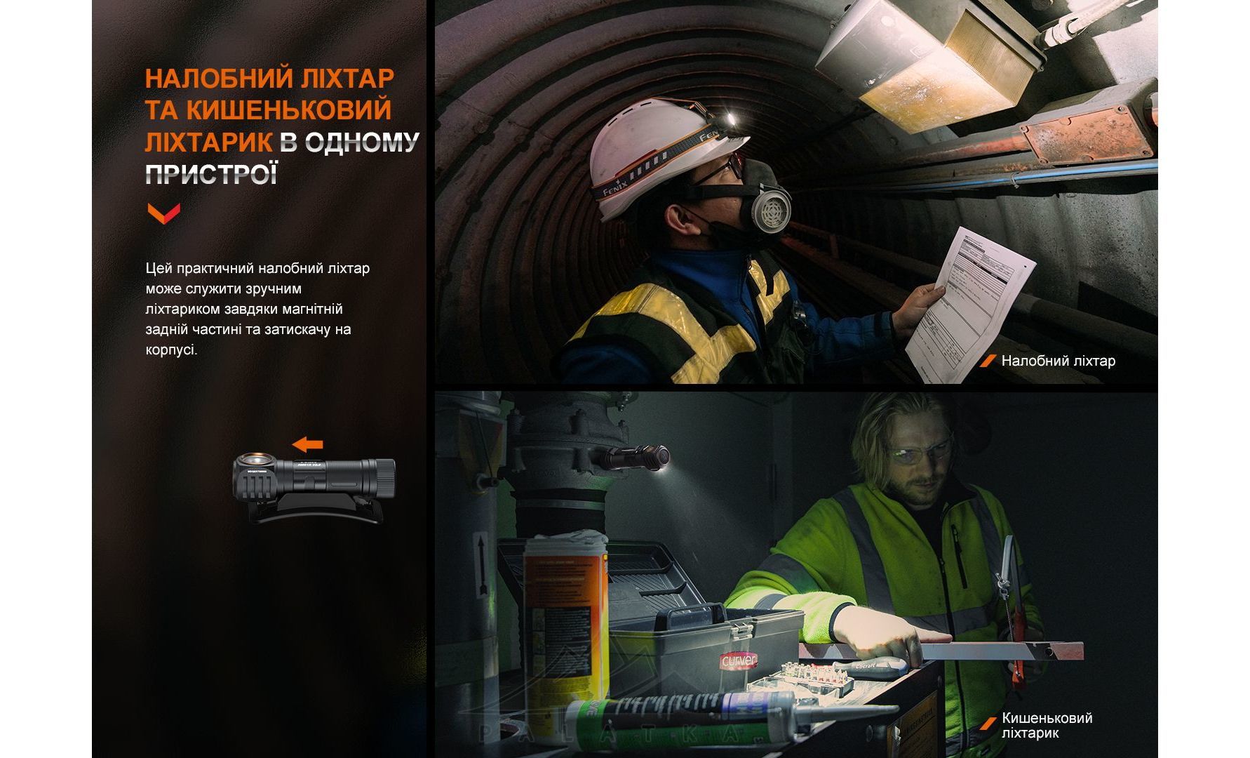 - Формат 2 в 1 — можна використовувати як налобний ліхтар і як універсальний робочий ліхтар.