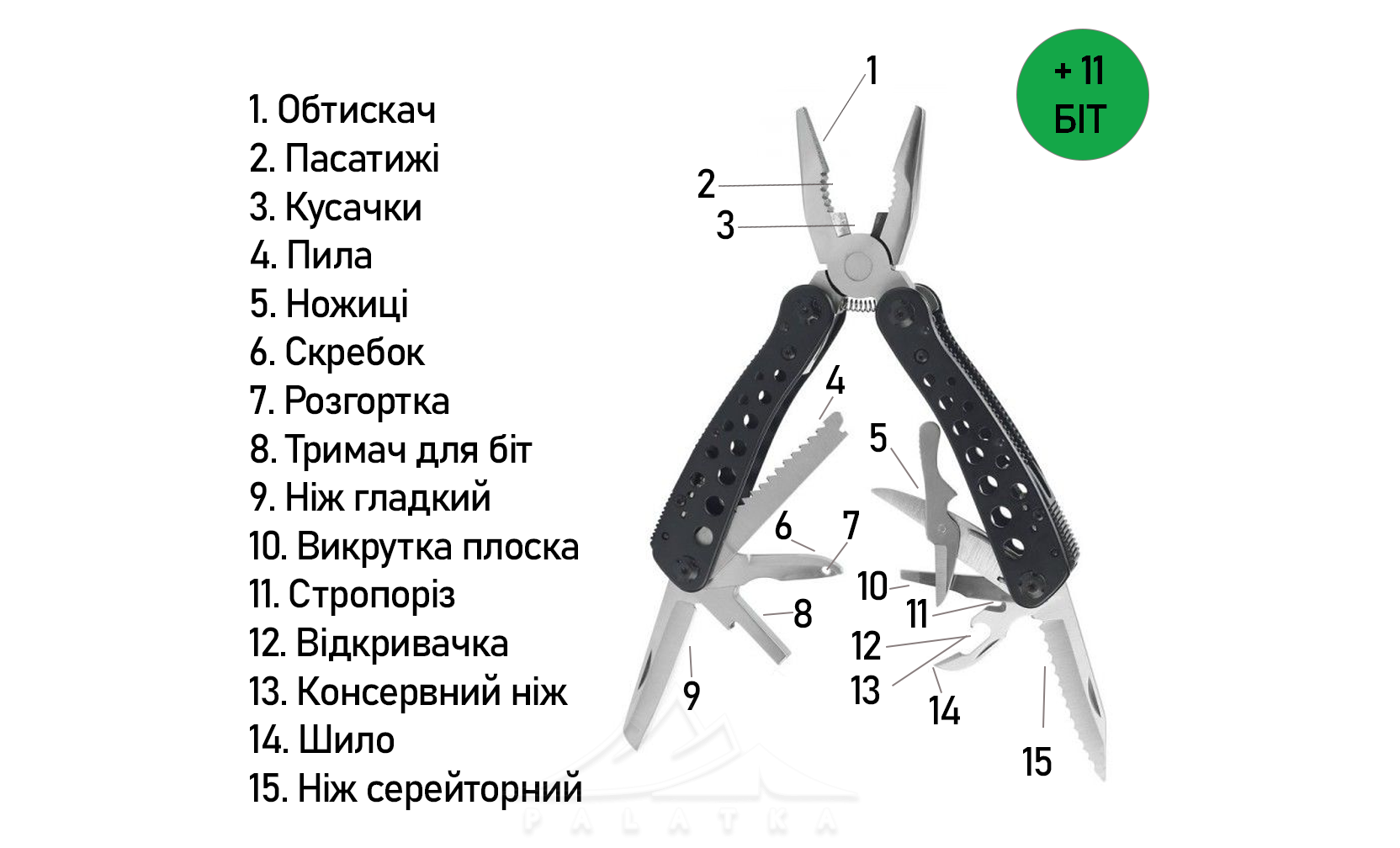 - Набір біт у комплекті підвищує функціональність мультитула.