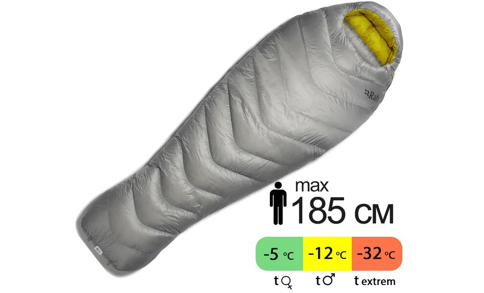 - Форма: вузька «мумія» з ергономічним футбоксом — мінімізує об’єм і втрати тепла, зберігаючи комфортну посадку під час сну.
