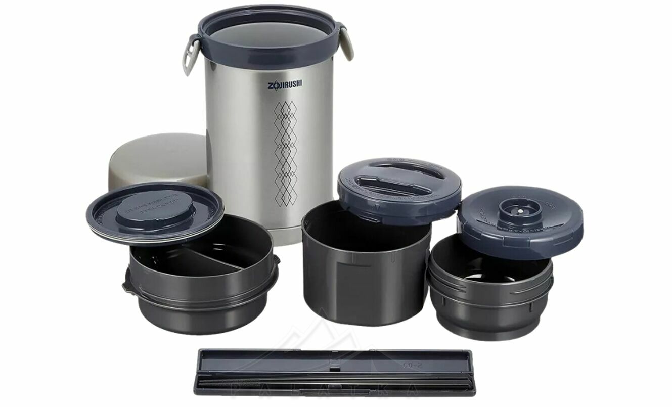 - Три контейнери різних об'ємів дозволяють брати із собою декілька страв одночасно; компактно вміщуються всередину термоса для зручного транспортування та роздільного зберігання їжі.