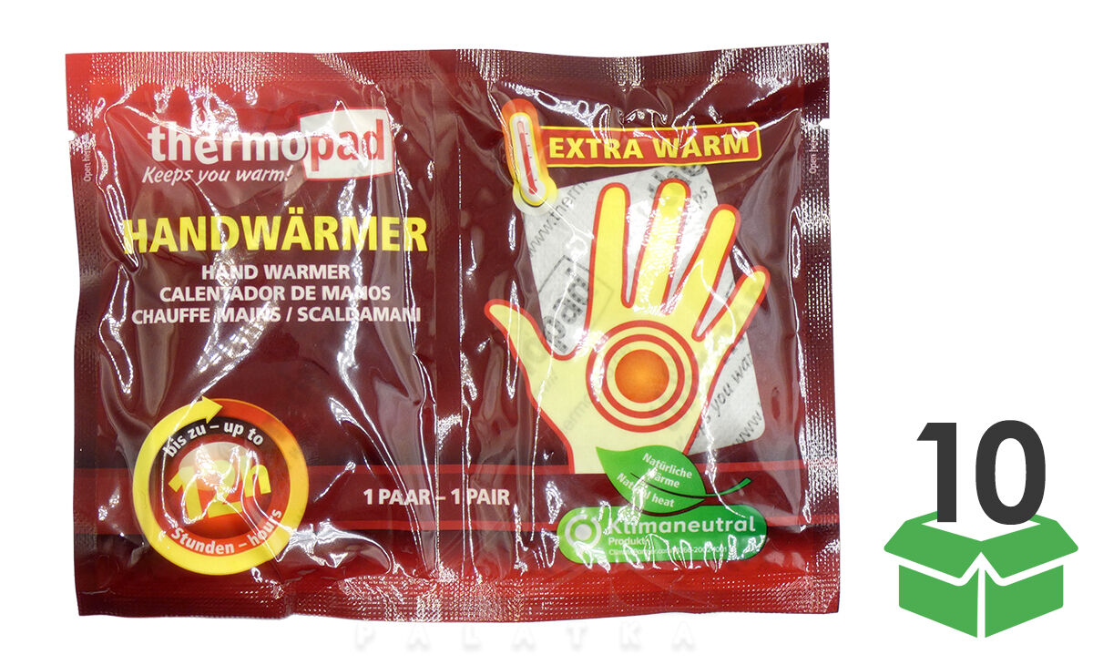 Thermopad Hand Warmer — одноразова грілка для рук, що активується повітрям. Виробляє тепло до 12 годин. Можна використовувати всередині рукавичок або в кишенях штанів/куртки. Грілки для рук ідеально підходять для будь-яких заходів на свіжому повітрі, таких як зимові види спорту або зимові прогулянки. Окрім цього, грілки можна використовувати для додаткового тепла в спальниках за холодних зимових умов.