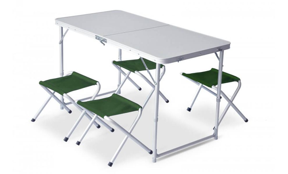 - Матеріал каркасу столу та табуретів — алюміній — він легкий та стійкий до корозії.