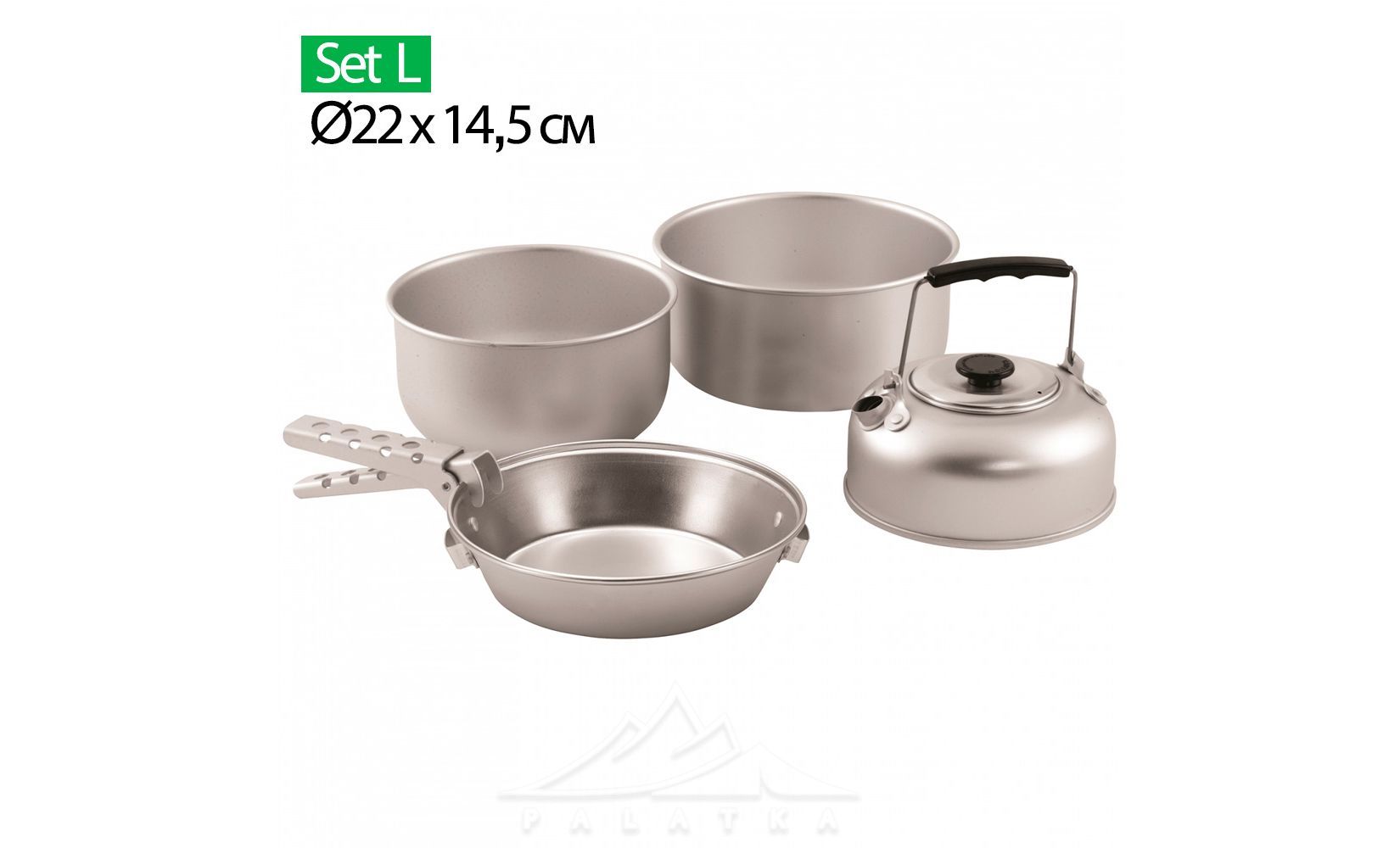 Набір посуду Easy Camp Adventure Cook Set - L - призначений для приготування їжі. Розрахований на 4 осіб. Виготовлений з алюмінію - легкого матеріалу. Дуже компактно пакується - це зручно, якщо ви ідете в похід.