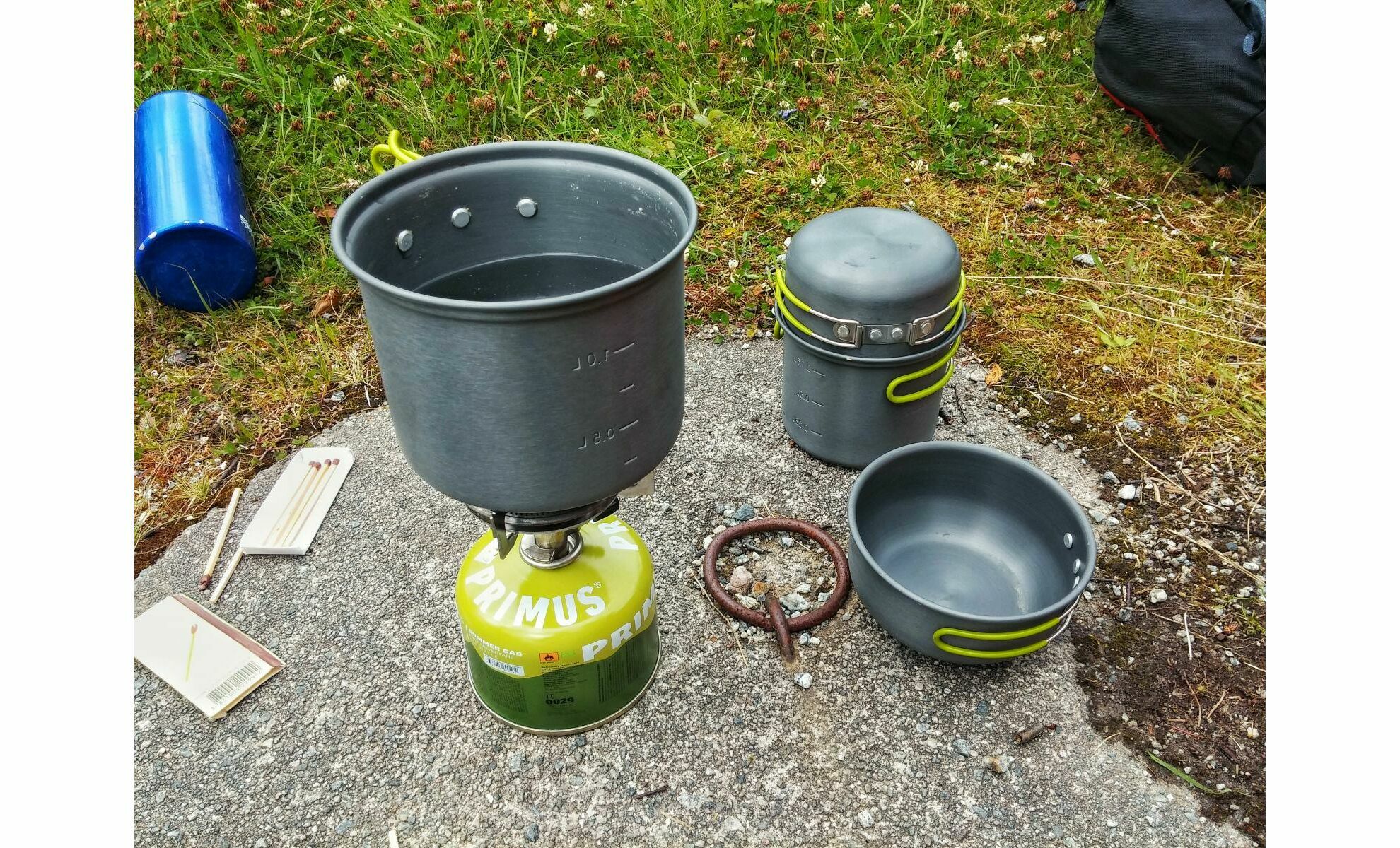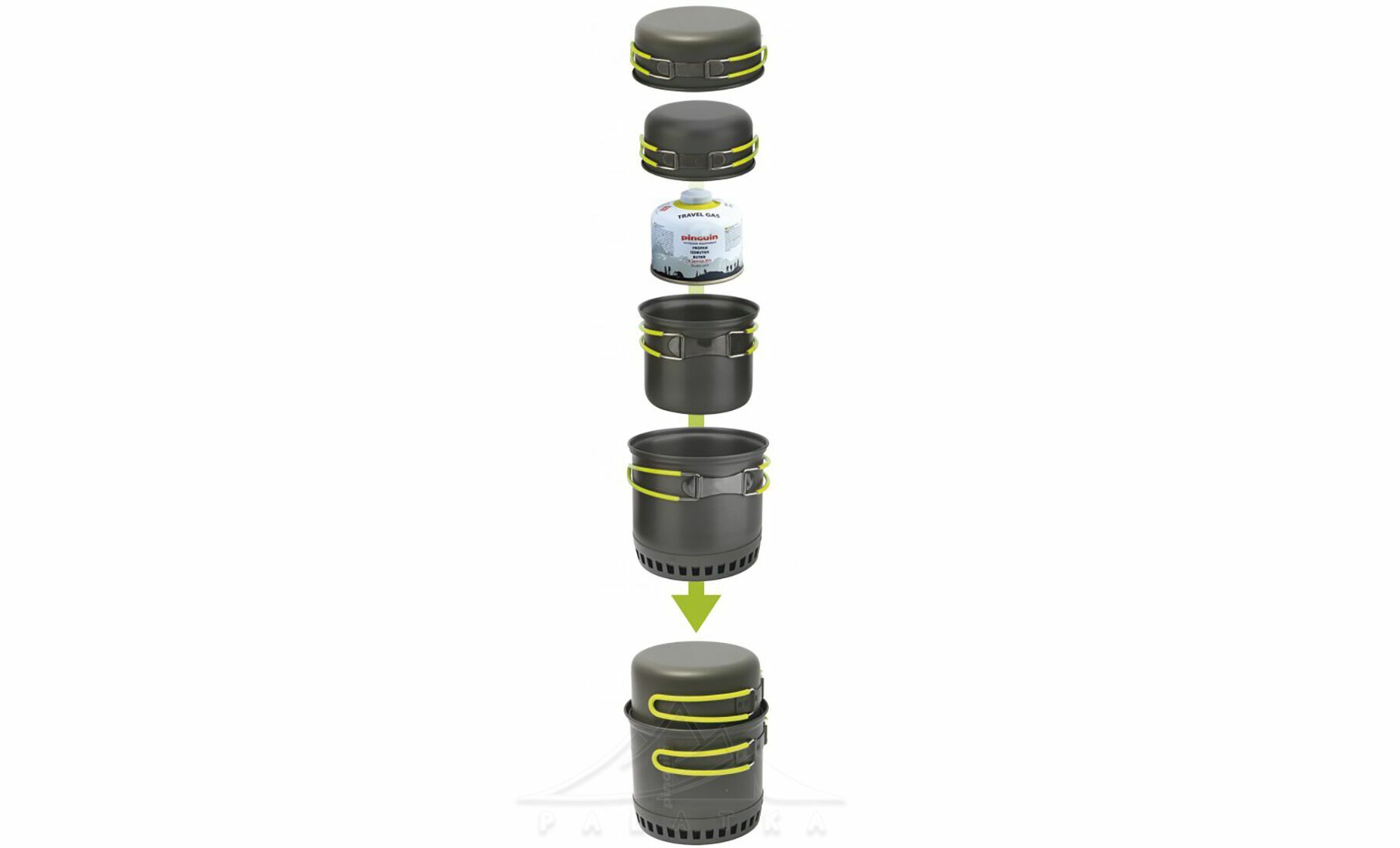 - Всередину меншої по об'єму каструлі поміщається газовий балон (об'ємом 230 г), та невеликий туристичний пальник (газовий балон та пальник не входить в набір).