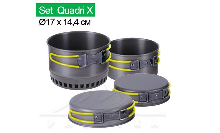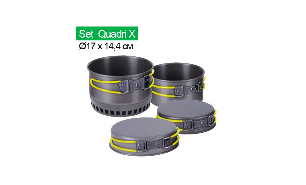 Pinguin Quadri X — базовий набір посуду з анодованого алюмінію для приготування їжі в похідних умовах, що має теплоомбінник. Відмінно підійде для подорожей з рюкзаком. Розрахований на трьох-чотирьох осіб.