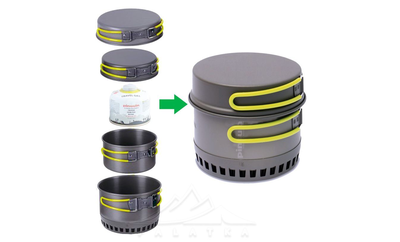 - Всередину меншої каструлі поміщається газовий балон (об'ємом 230 г), та невеликий туристичний пальник (газовий балон та пальник не входить в набір).