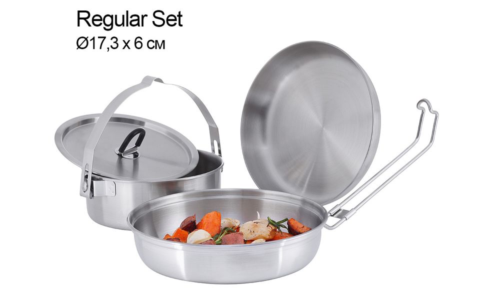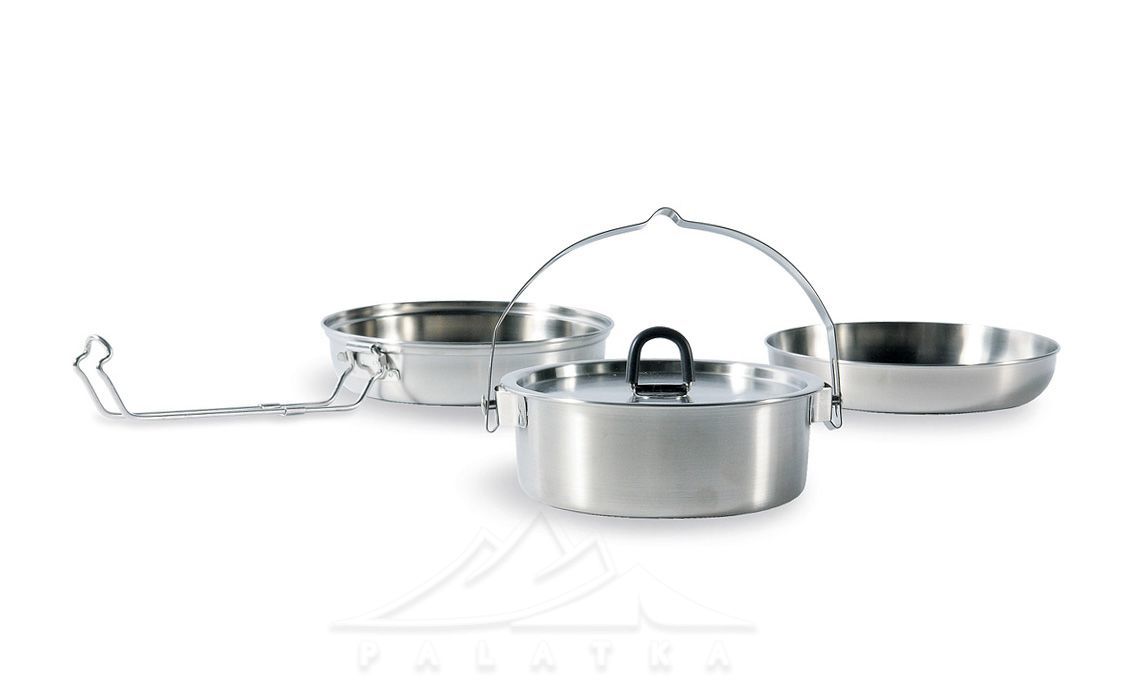Tatonka Camp Set — компактний кемпінговий набір посуду з міцної нержавіючої сталі, призначений для приготування їжі. Підійде для однієї особи.