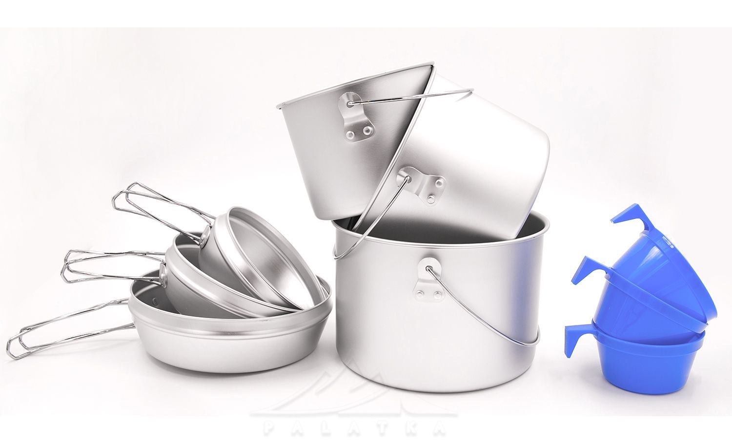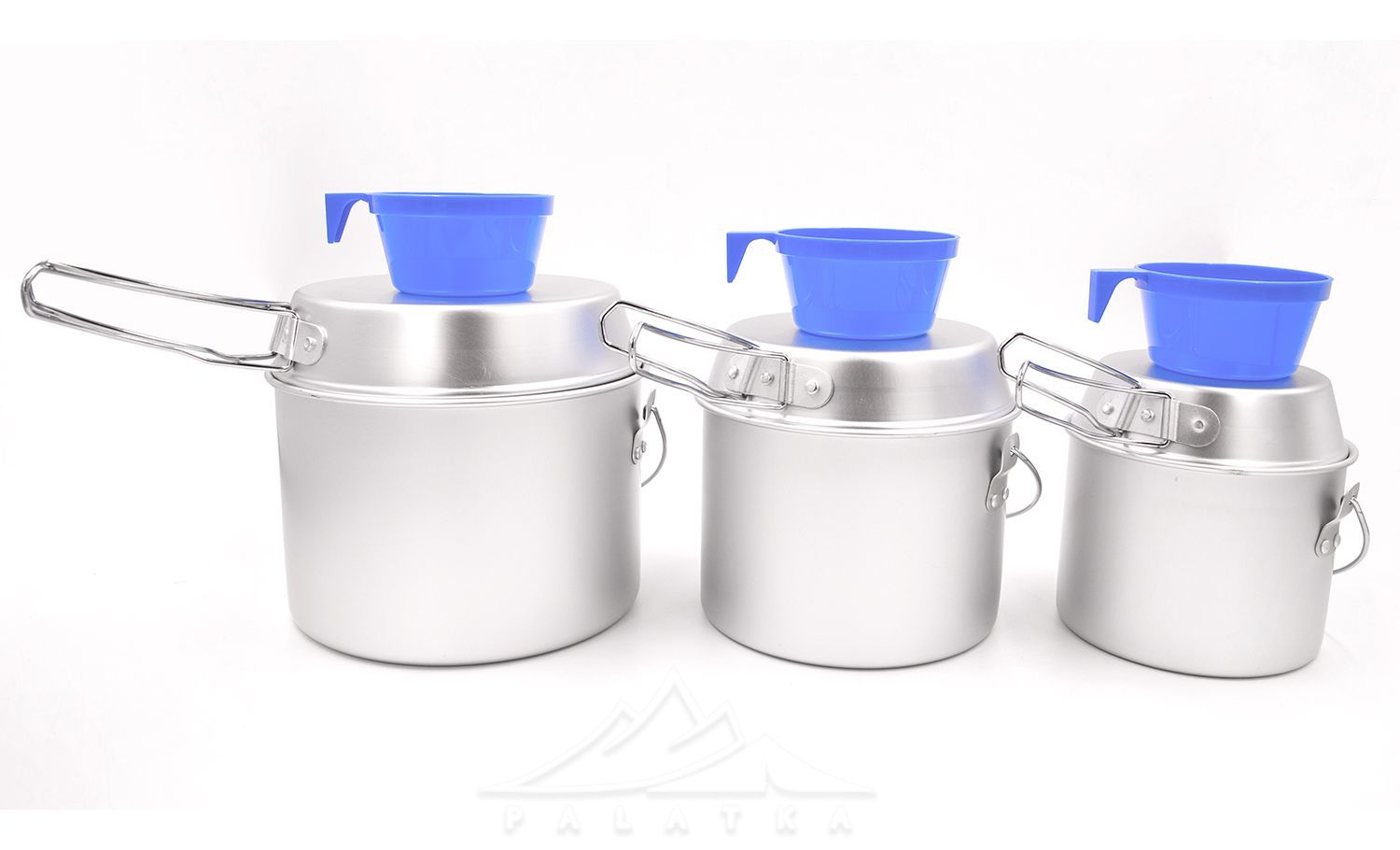 В комплект входить: казанок 2,9 л, казанок 1,9 л, казанок 1,2 л, сковрода-кришка - 3 шт., пластмасові кружки 3 шт.