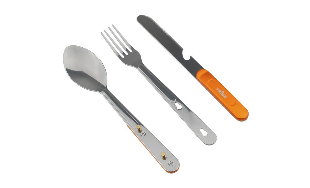 Tribe Camp Set — набір столових приладів із нержавіючої сталі, що складається з трьох предметів. Універсальний вибір для походів, кемпінгу, риболовлі та подорожей.