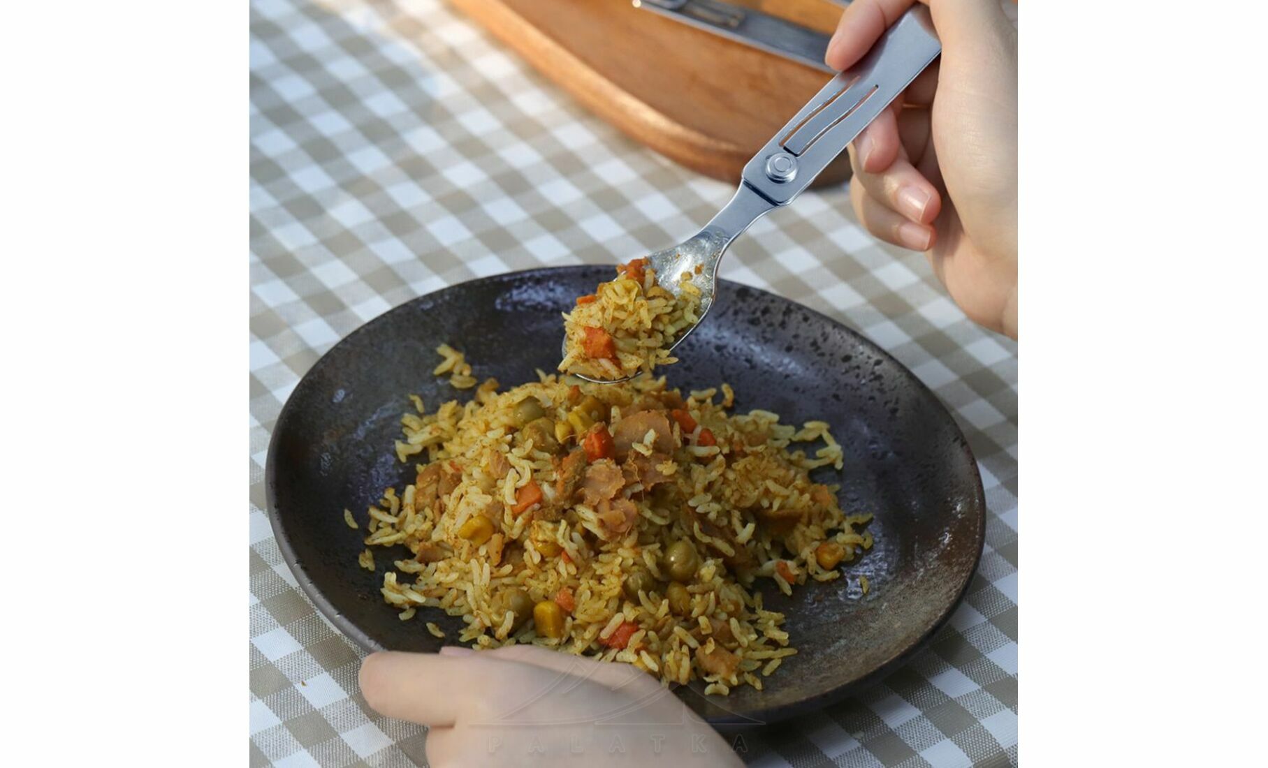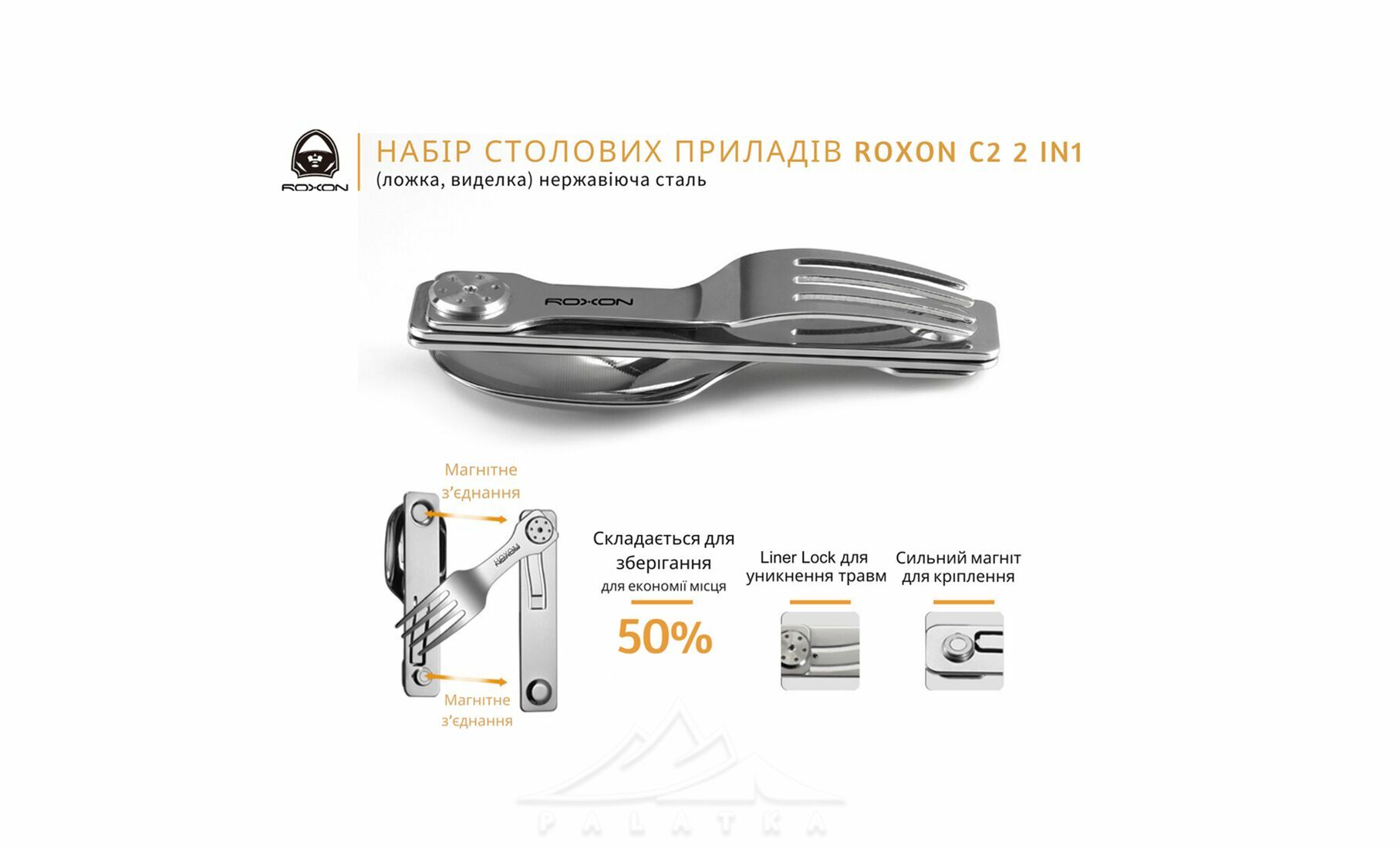 Roxon C2 2 в 1 — універсальний набір складних столових приборів, що включає ложку та виделку з магнітним з'єднанням. Ідеальний вибір для кемпінгової кухні, пікніків та походів.