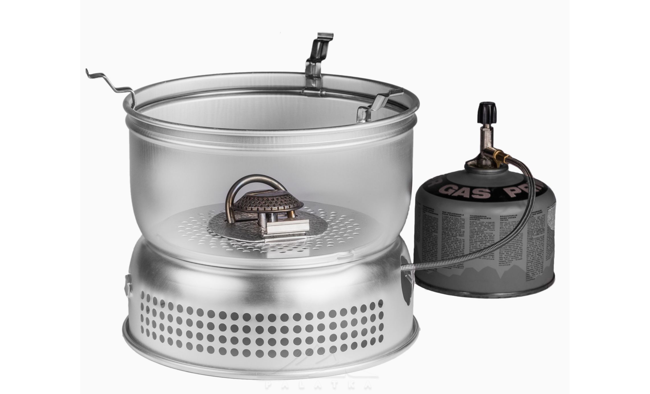 В комплект входить: дві каструлі, сковорода, знімна ручка-тримач, газовий пальник зі шлангом та вітрозахисна підставка (газовий балон не йде в комплекті).
