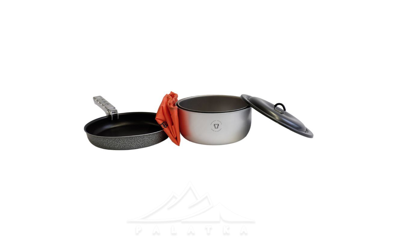 В комплект входить: два казанки, сковорода, кришка, знімна ручка-тримач, чохол.