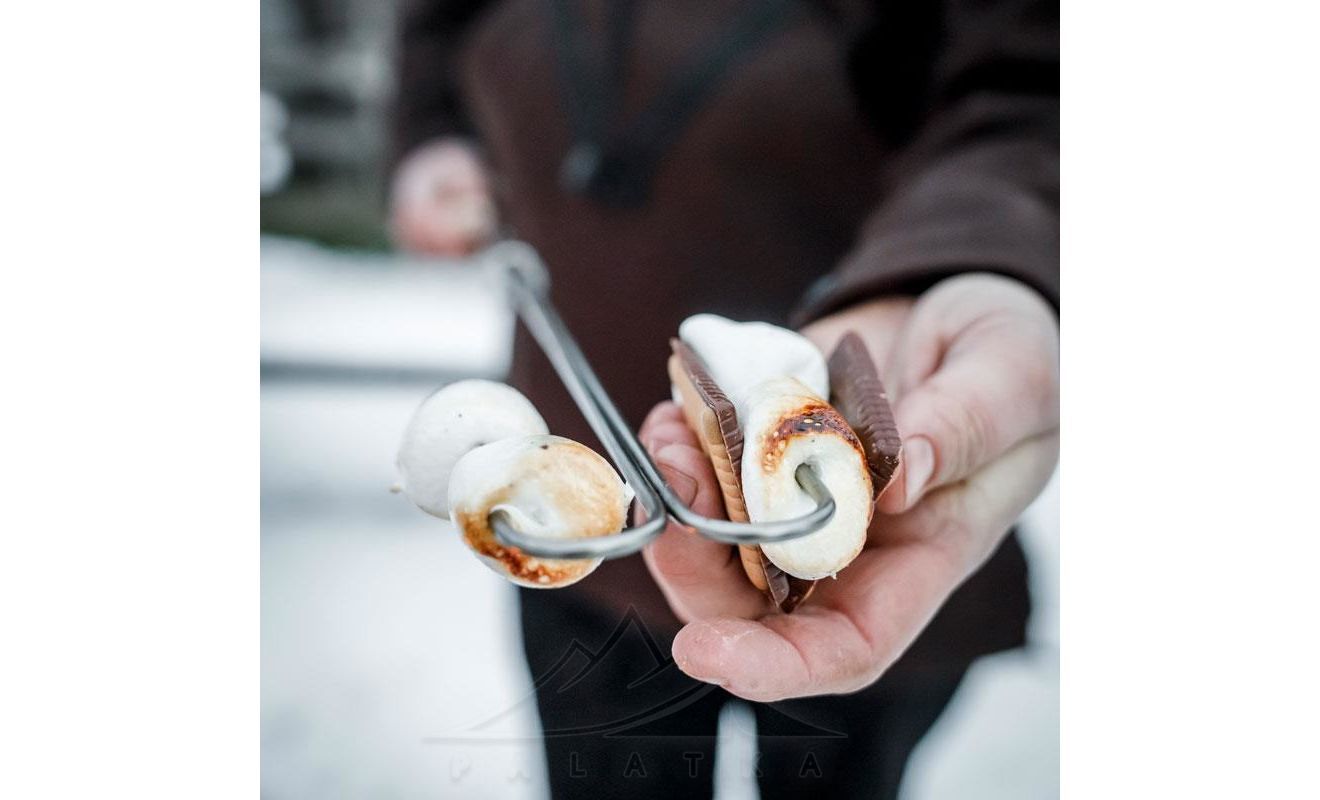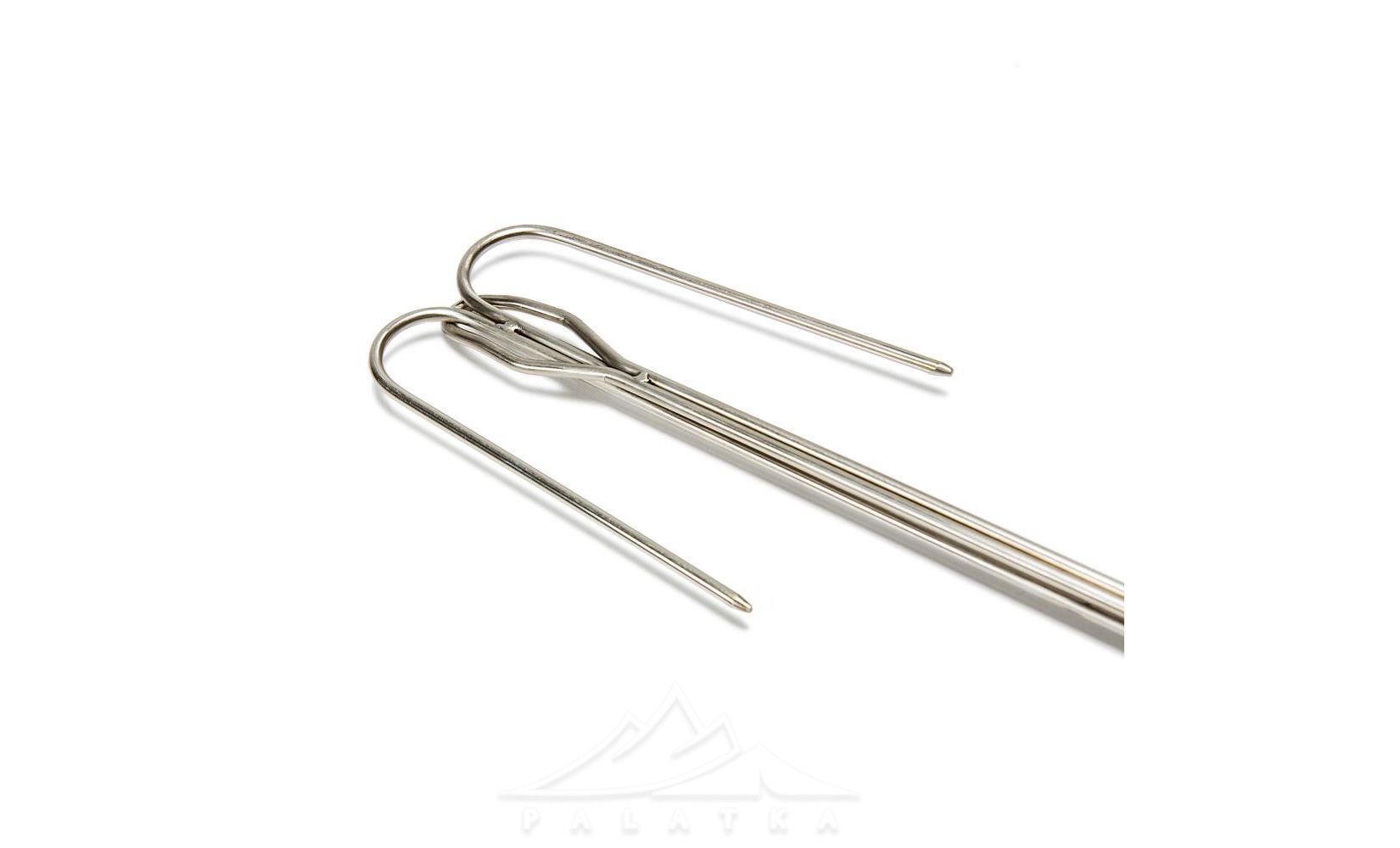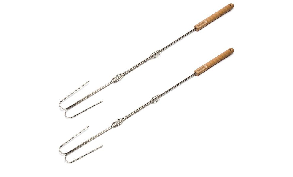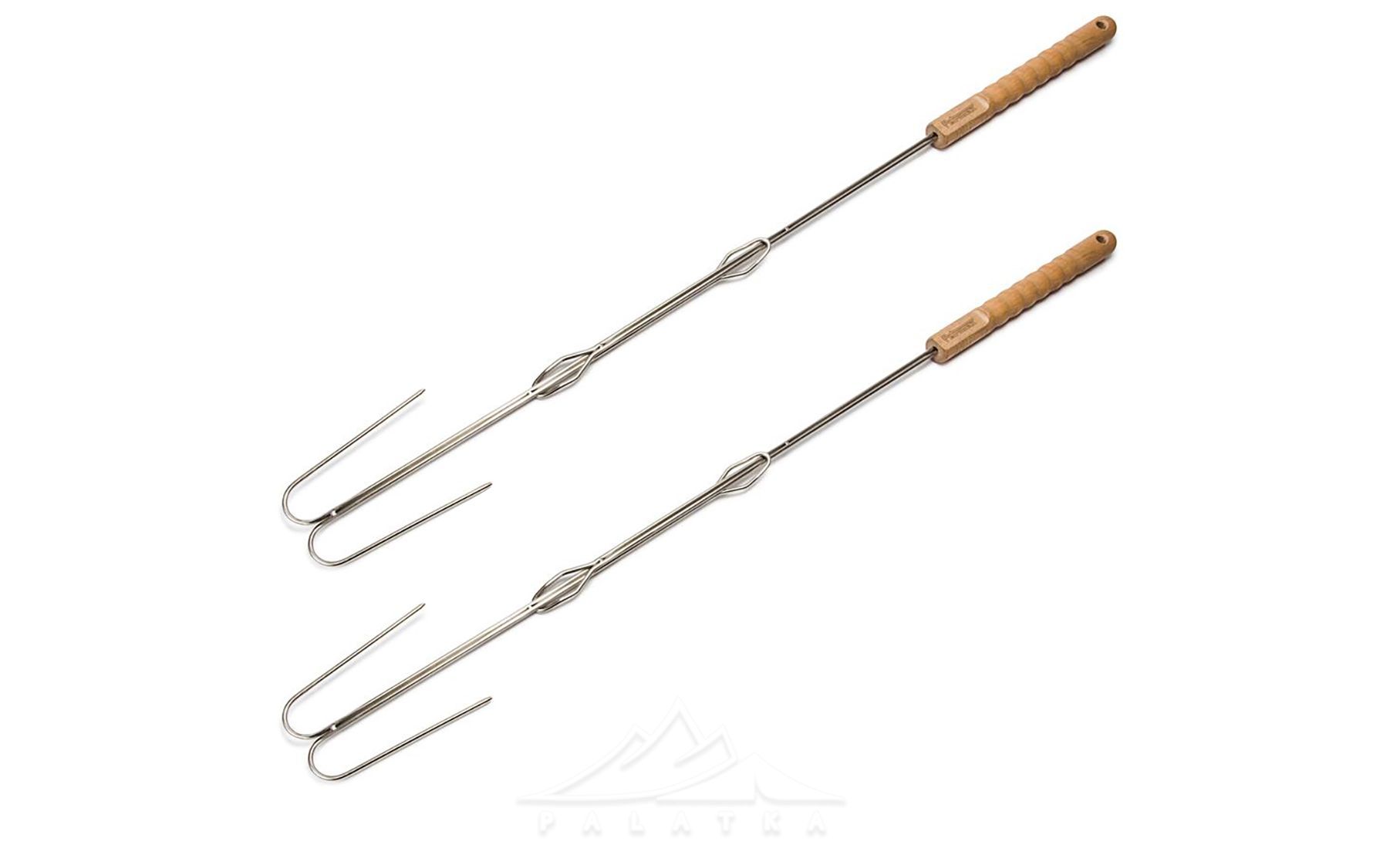 - Два зубці шампура мають загнуту форму, яка надійно утримує їжу під час приготування над вогнищем.