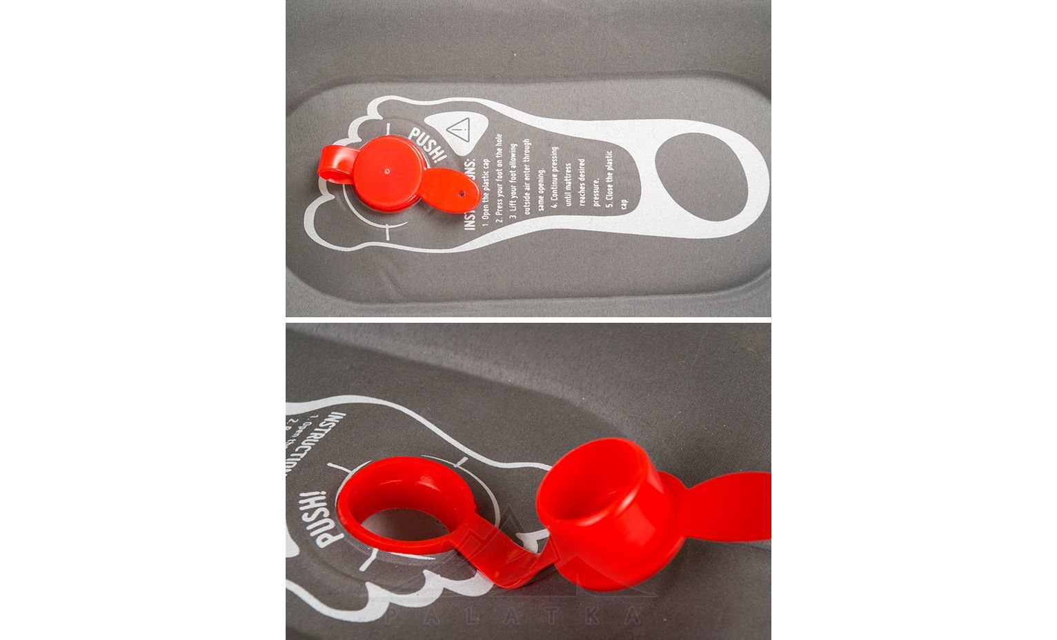 - Має вбудований насос — для того, щоб накачати килимок потрібно тиснути на клапан ногою поки килимок повністю не надується.