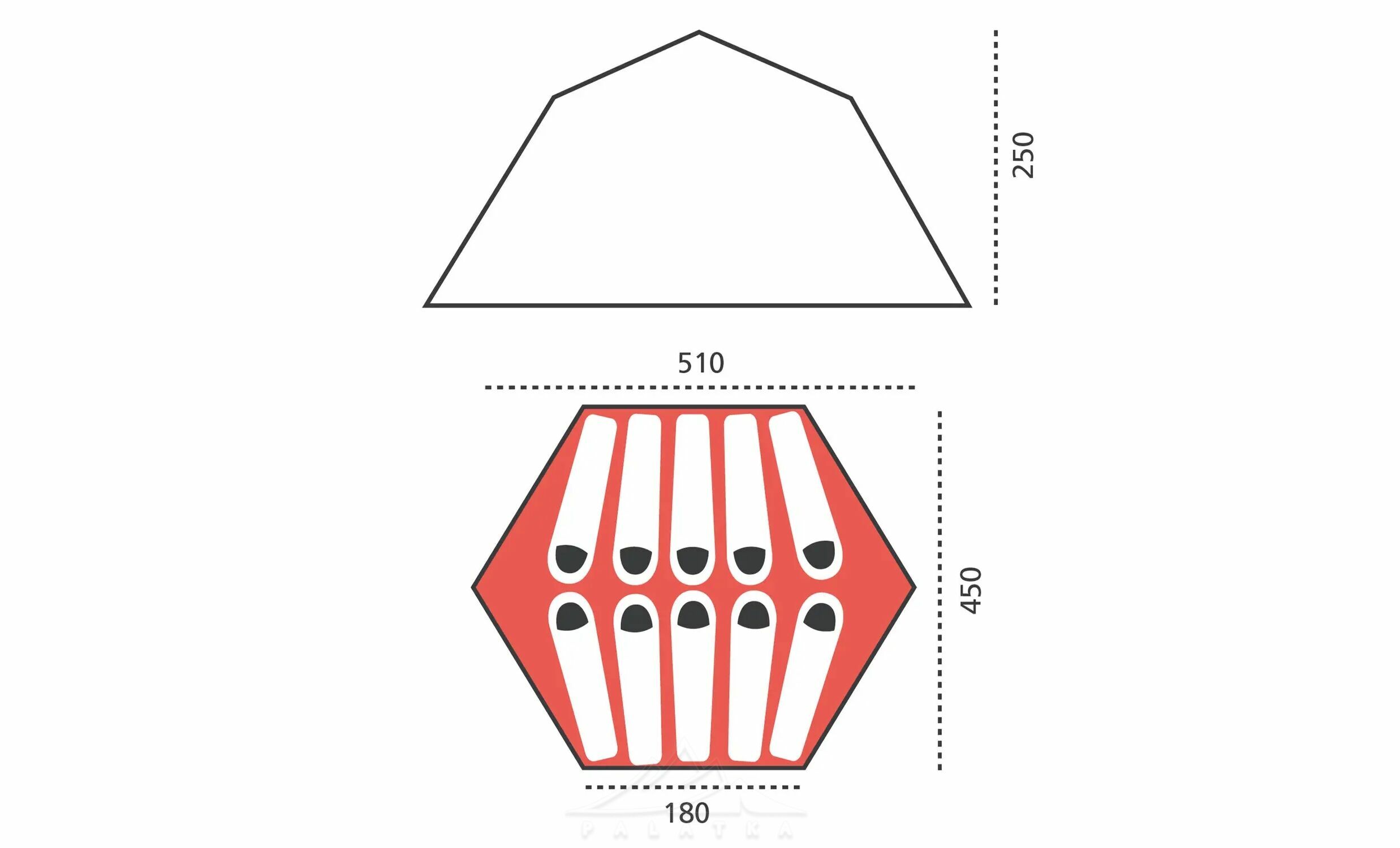 Намет має великий внутрішній простір, що дає можливість переміщатись по всьому намету в повний зріст. В найнижчій точці висота намету становить 180 см, а в найвищій - 250 см. В наметі вільно розмістяться десять людей для ночівлі, а вдень для спілкування в наметі, укритись від негоди або пекучого сонця може велика компанія з 15 людей.