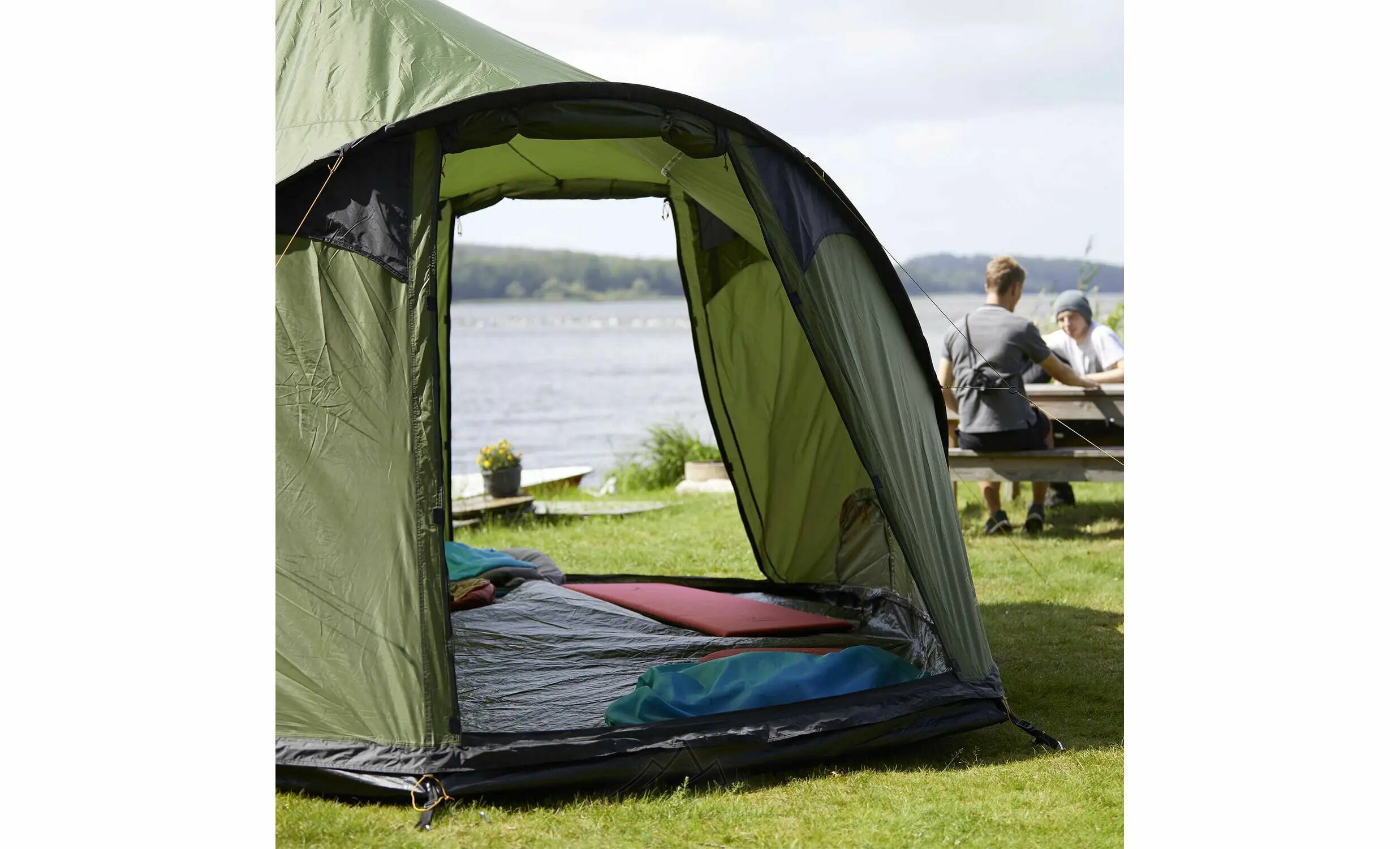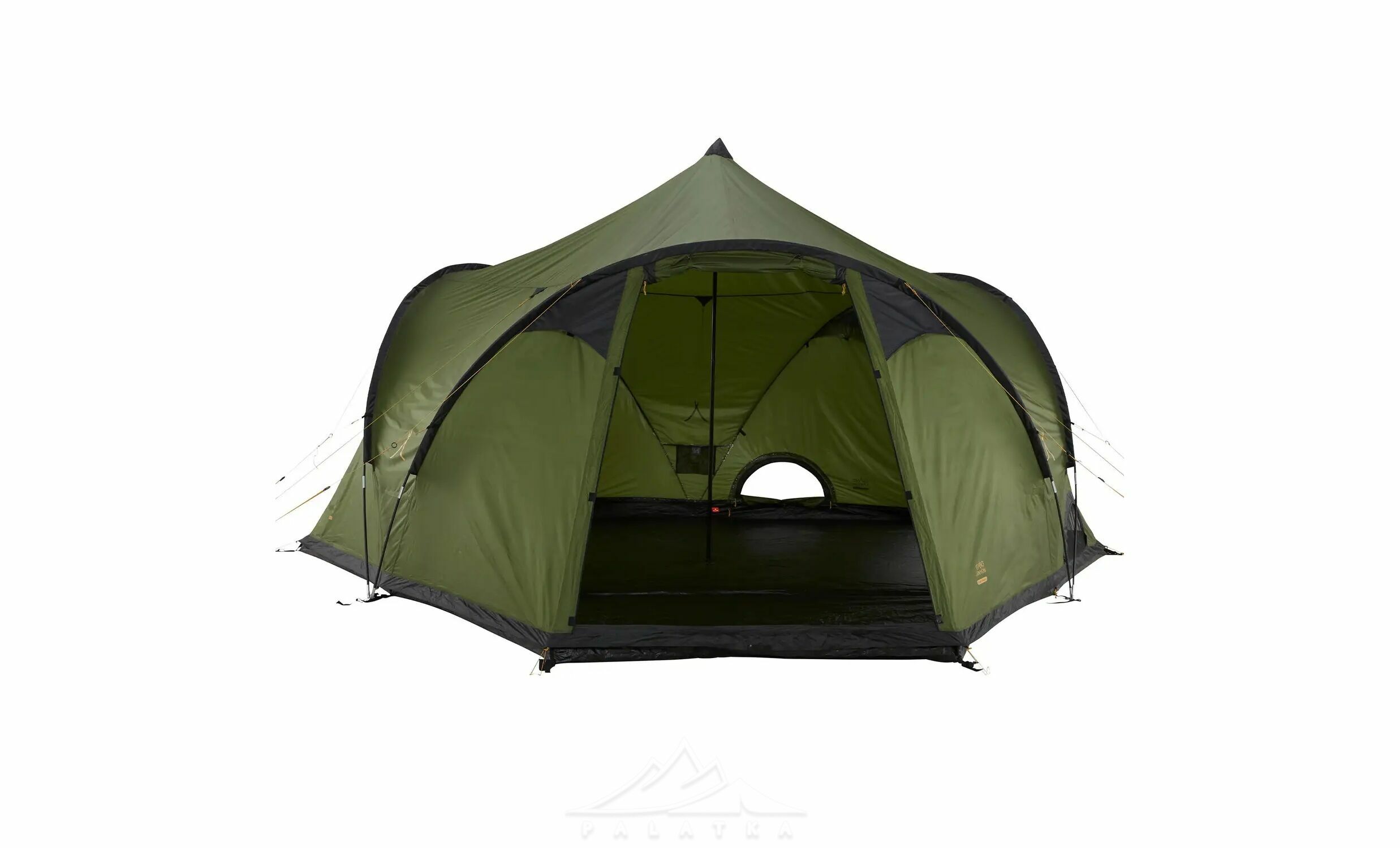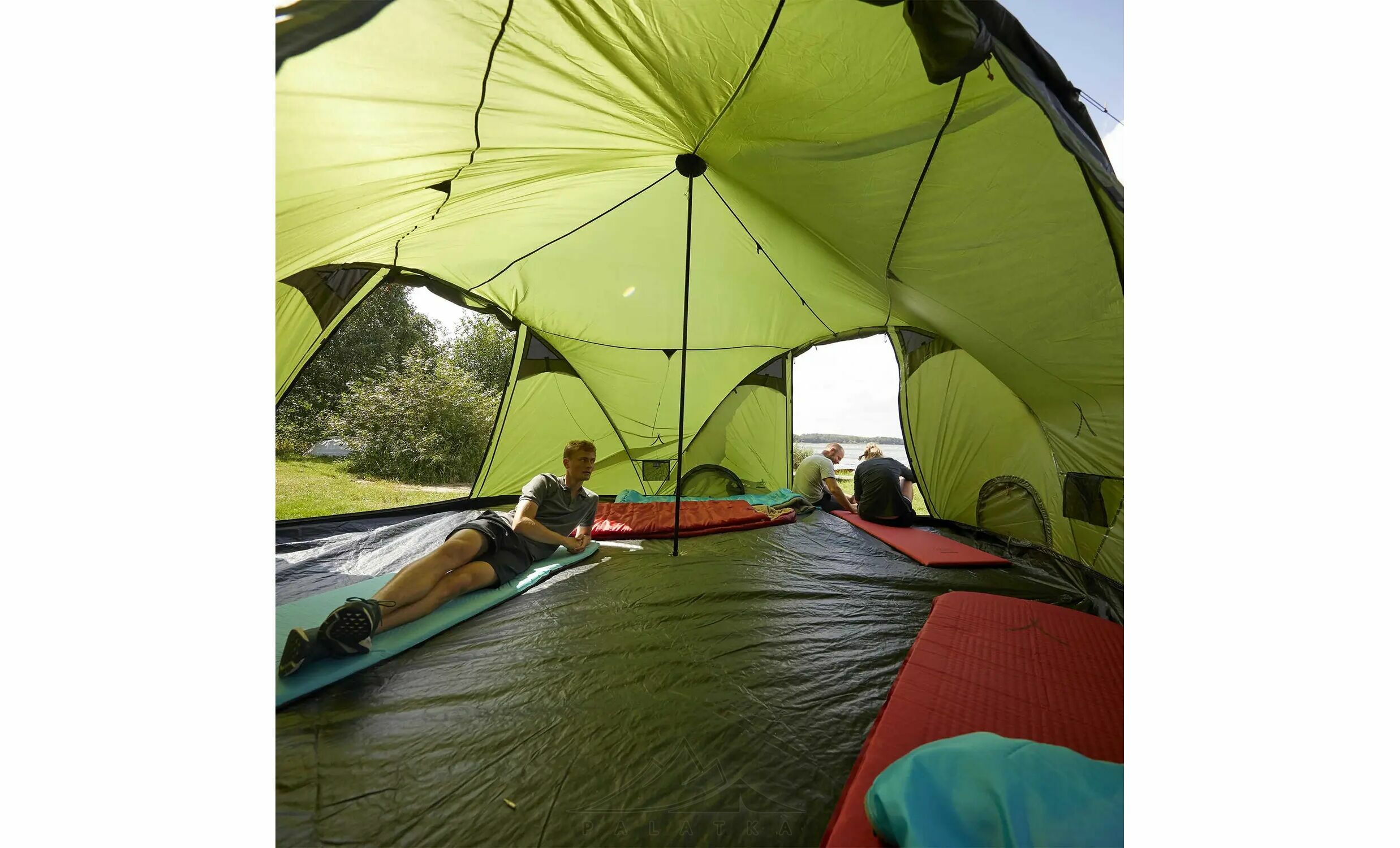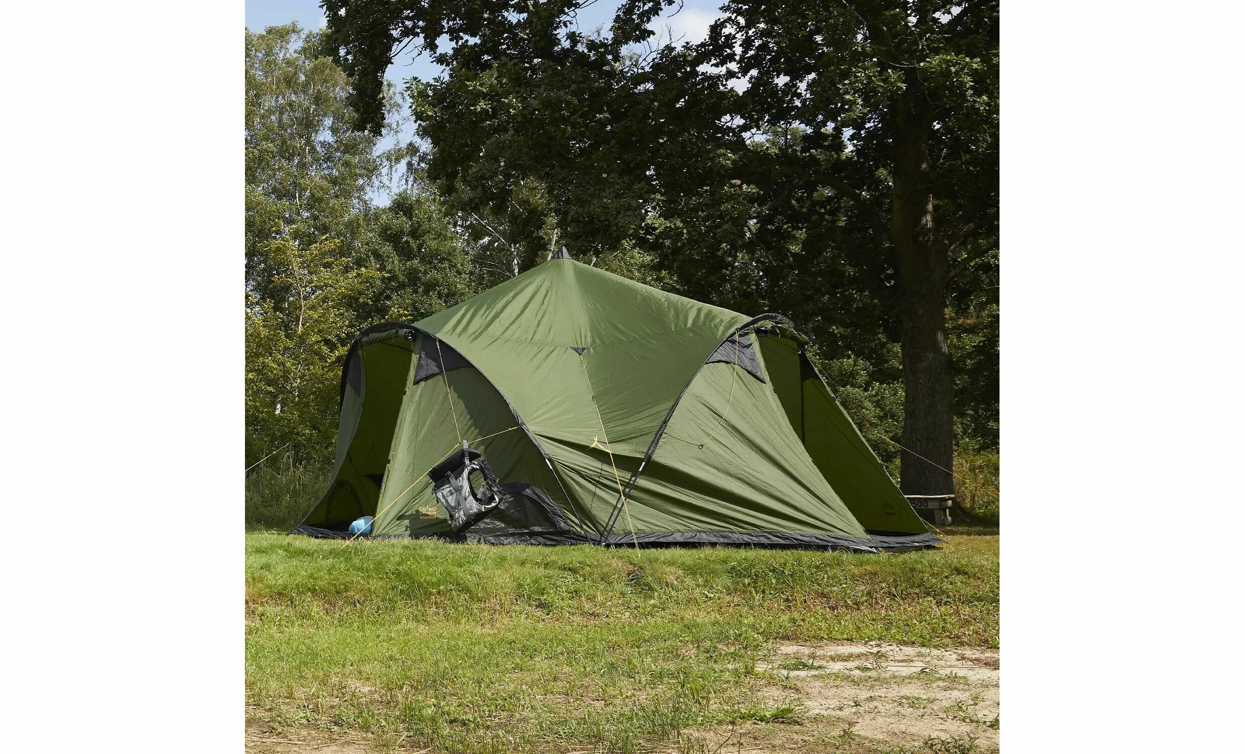 - Три великих входи в намет можуть бути повністю закриті, повністю відкриті, а також закриті москітними сітками. Кожна з дверей застібається на блискавку і має москітну сітку.