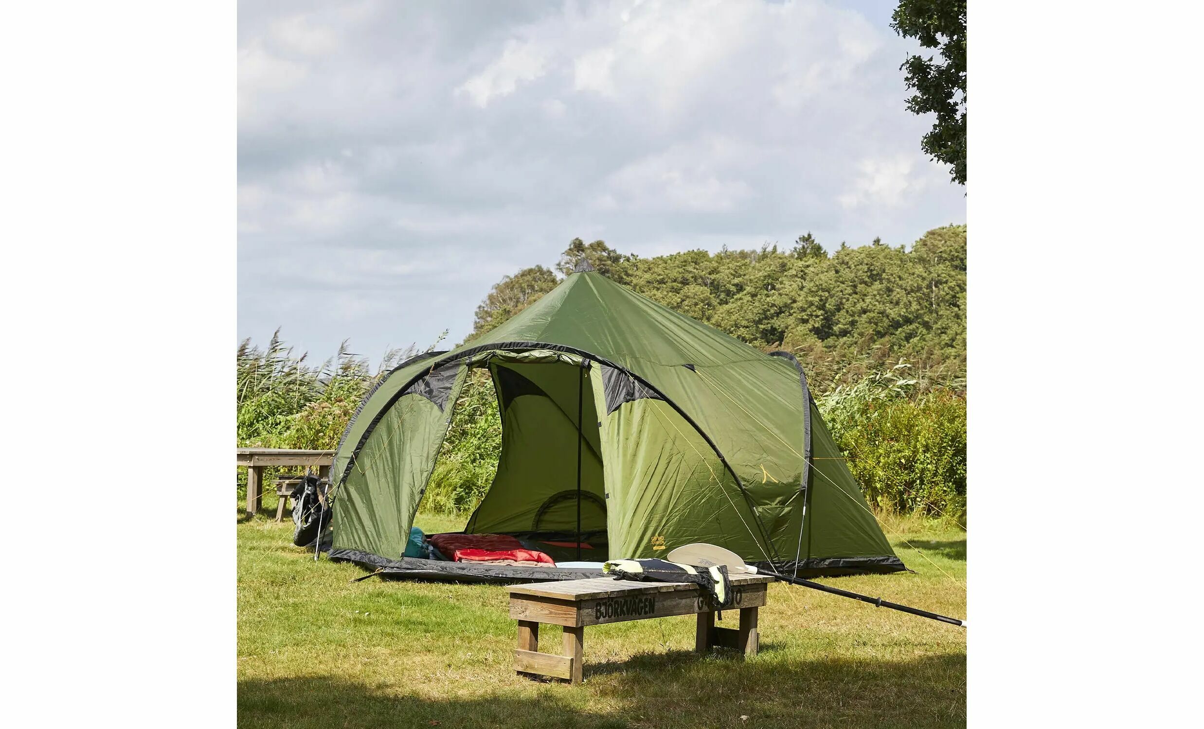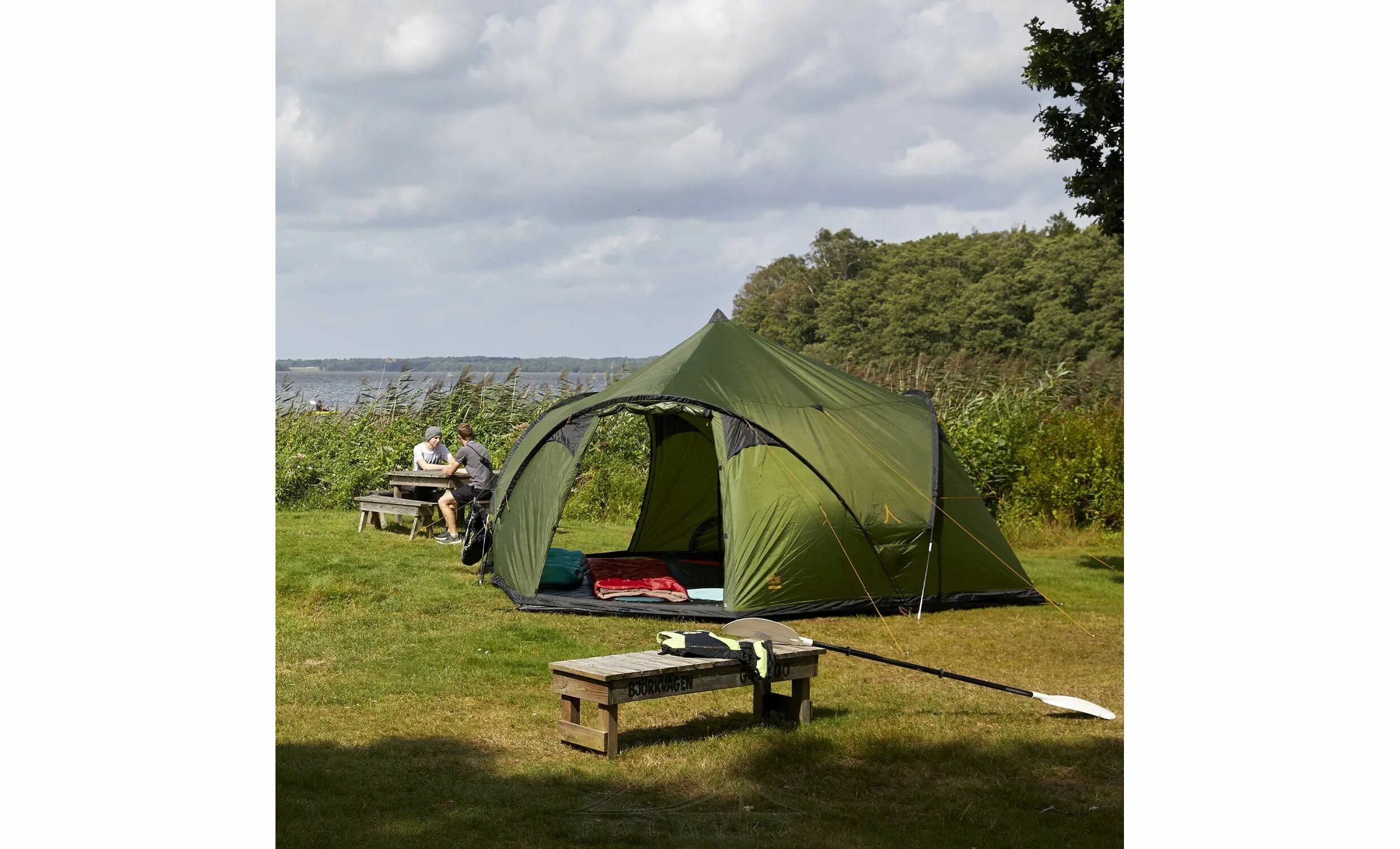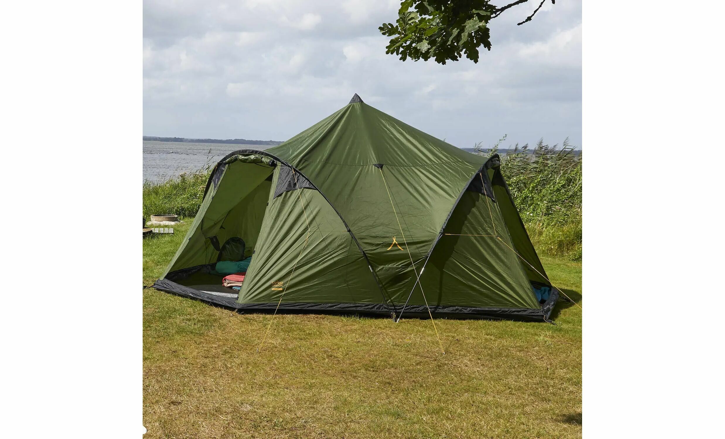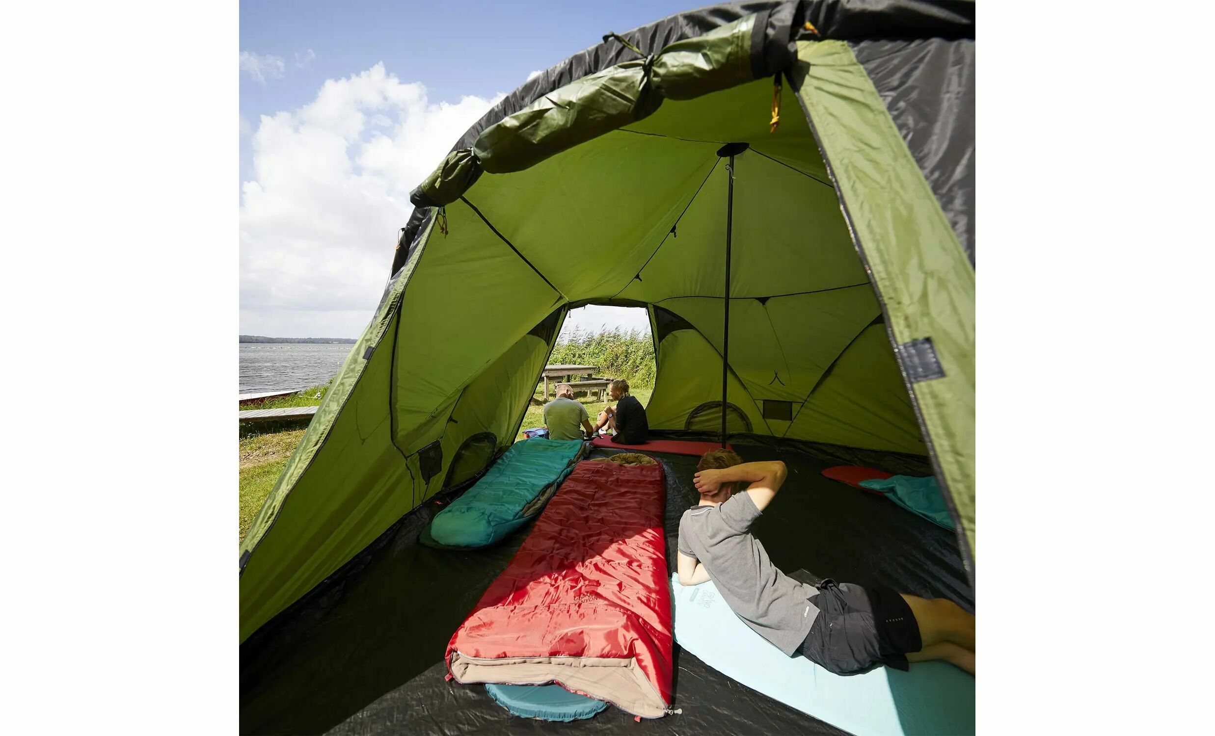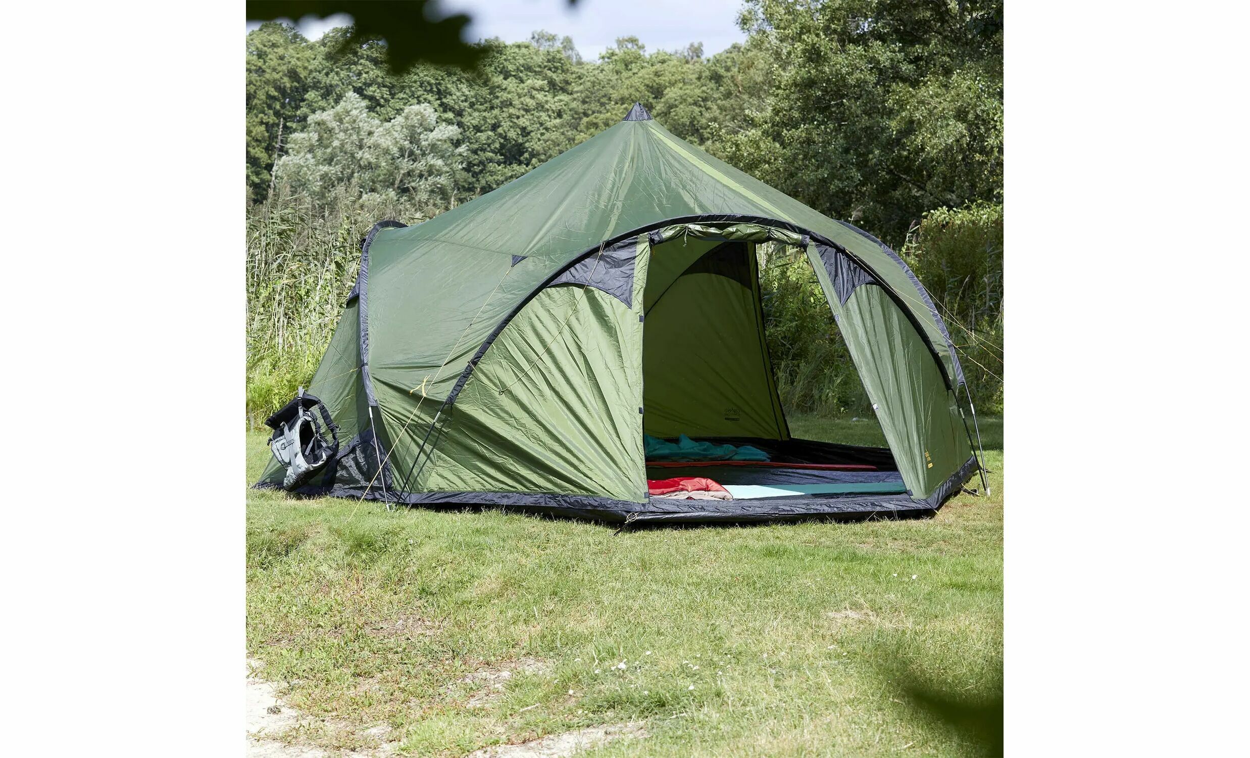 - Три великих входи в намет можуть бути повністю закриті, повністю відкриті, а також закриті москітними сітками. Кожна з дверей застібається на блискавку і має москітну сітку.