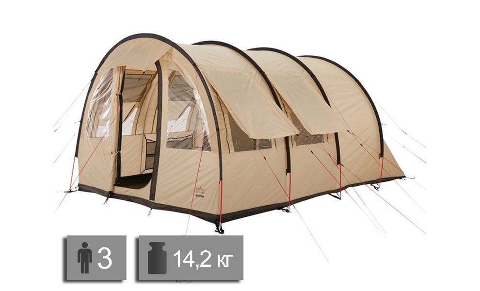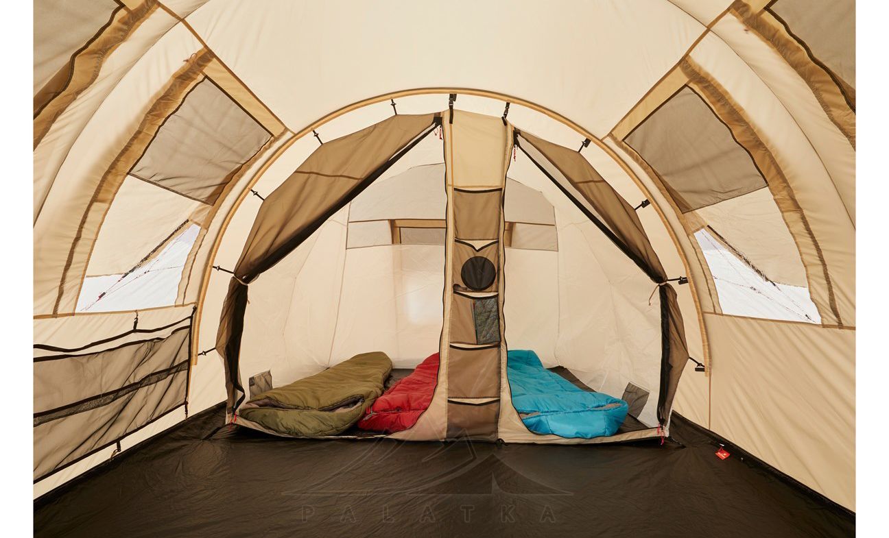- Тунельна конструкція: дає дуже ефективний внутрішній об’єм (стіни ближчі до вертикальних), тому в наметі значно комфортніше знаходитися тривалий час, більше корисного простору.