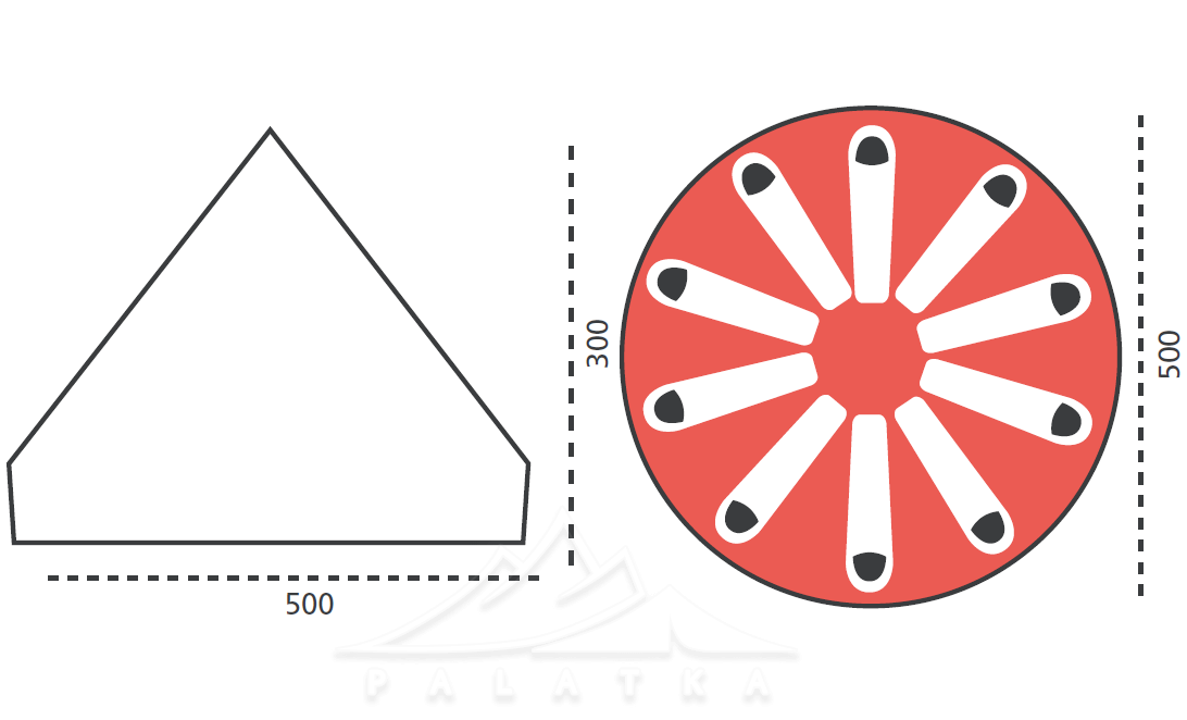 - Основними перевагами цієї конструкції з центральною стійкою є низька вага у співвідношенні до площі і кількості місць. Конструкція дозволяє максимально швидко встановлювати намет та пересуватись в центрі намету в повний зріст.