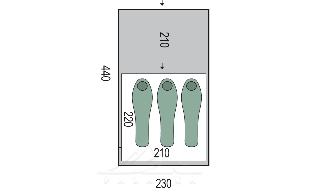 - 1 спальня (внутрішній намет), що підвішується до зовнішнього намету зсередини.