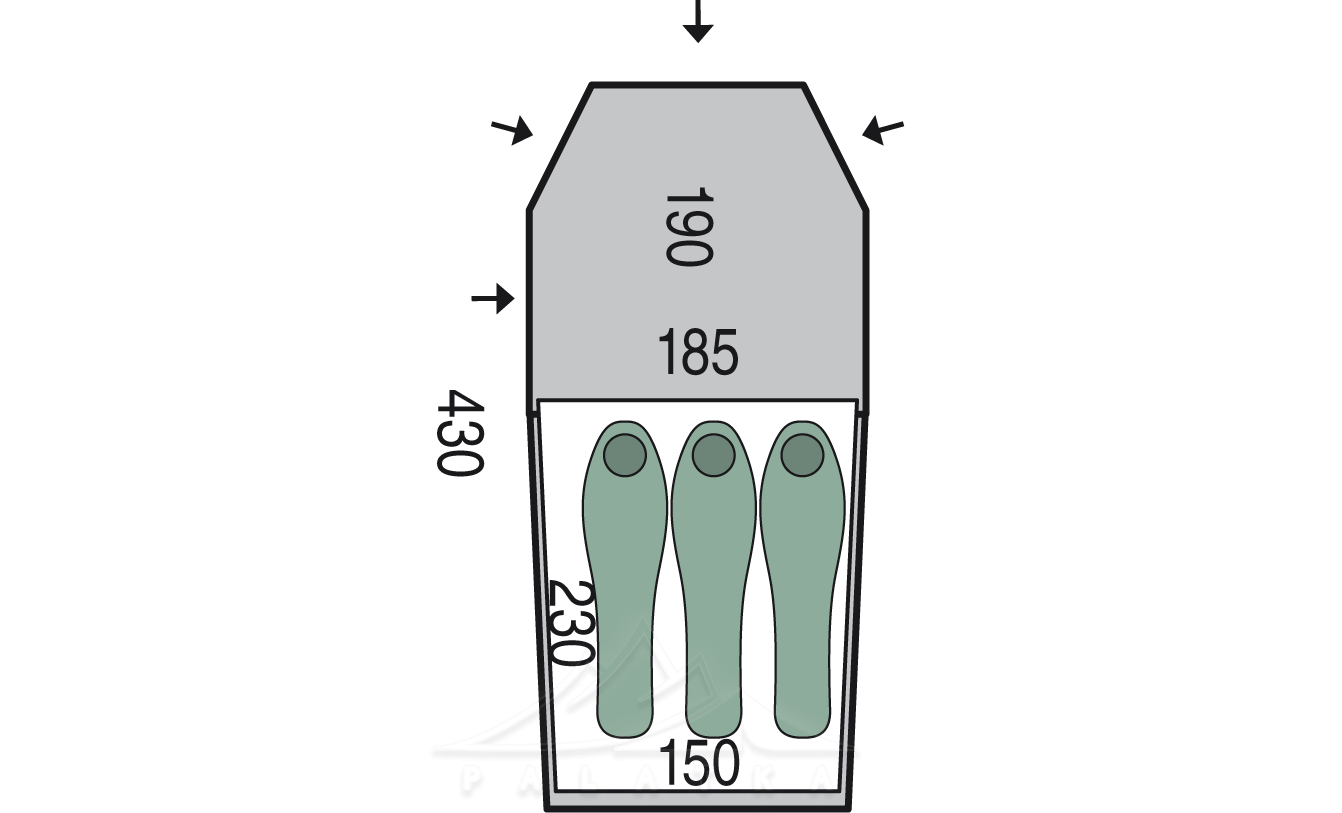 - 1 дуже місткий тамбур для розміщення спорядження та взуття, а також приготування їжі за негоди.