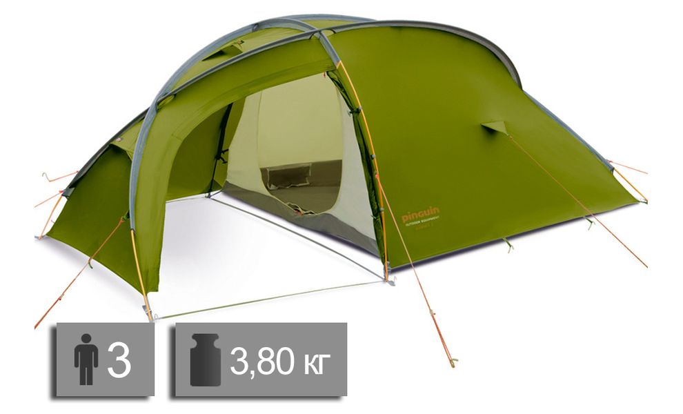 Намет Pinguin Summit 3 Duralu — полегшений 2-3-місний намет з зовнішнім каркасом з алюмінію. Форма каркасу забезпечує дуже високу стійкість намету для складних погодних умов. Розрахована для всесезонних піших походів, мото- та вело-туризму. Має збільшений тамбурам з 2-ма входами.
