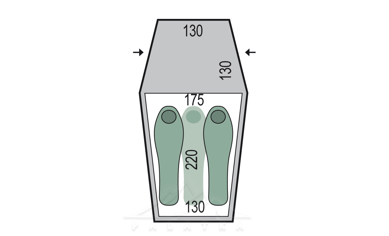 - 1 збільшений тамбур (за рахунок додаткової дуги) для розміщення спорядження та взуття, а також приготування їжі за негоди.