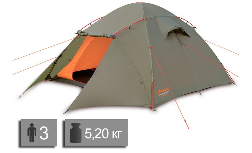 Намет Pinguin Taifun 3 — 3-4-місний намет для пішого туризму та подорожей. Зовнішній каркас. Посилена конструкція проти сильних вітрів. Має 2 входи та 2 тамбури. Розрахований на 3-сезонне використання.