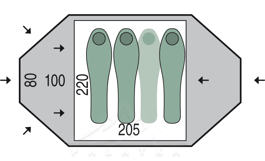 - Підлога спальні з посиленого поліетилену (PE RipStop), водостійкістю 8 000 мм H2O.
