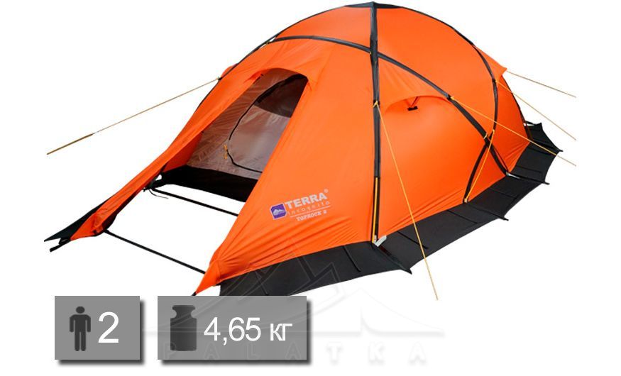 Намет Terra Incognita TopRock 2 — 2-місний всесезонний намет з 2-ма входами та 2-ма тамбурами. Зовнішній каркас з алюмінію. Захисна спідниця. Конструкція стійка до сильних вітрів та опадів.