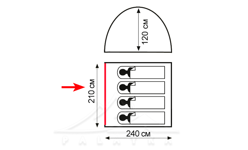 - Має один Т-подібний вхід, на блискавці. Двері дублюються москітною сіткою.