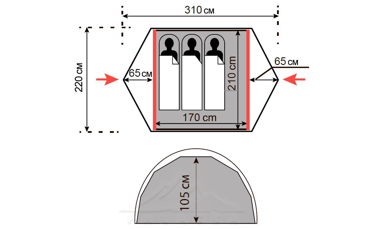 - Зовнішній тент з полегшеного та посиленого нейлону з силіконізацією, водостійкістю 4 000 мм H2O