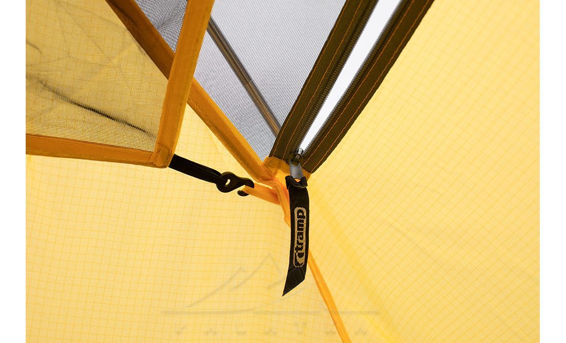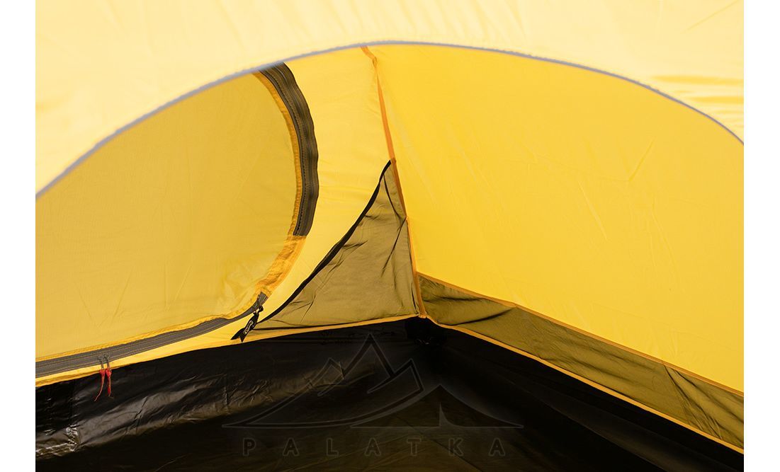 - Сітчасті вентиляційні вставки вгорі на внутрішньому наметі, з блискавками, що дозволяє регулювати вентиляційні віконця зовнішнього намету не виходячи назовні