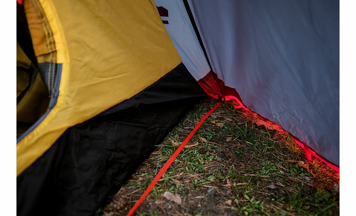 - Штормові відтяжки зі світлоповертаючими елементами для фіксації намету, добре помітні у світлі ліхтаря.