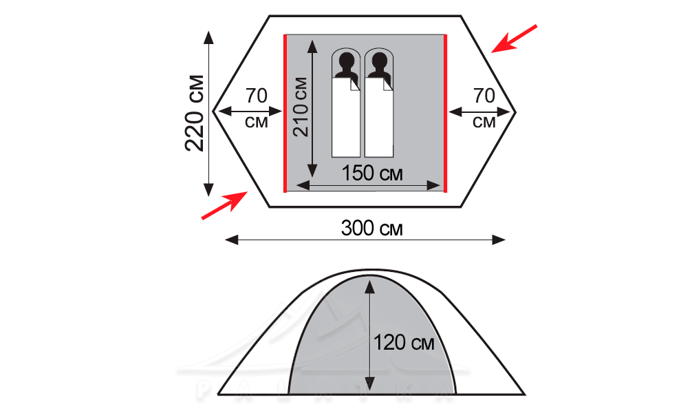 - 2 вентиляційні віконця у зовнішньому тенті, зі складними стійками-підпорами.