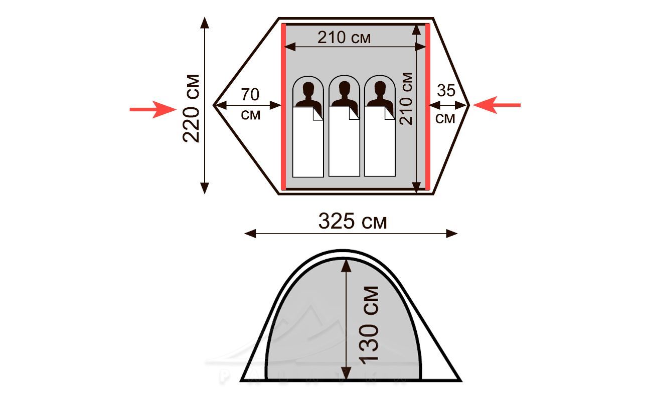 - Двошарова конструкція: зовнішній тент та внутрішній намет (спальня).