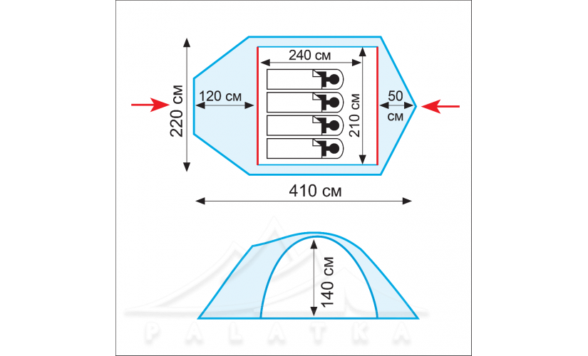 - Збільшений основний тамбур (з додатковою дугою) для розміщення спорядження та взуття, чи навіть для організації кухні під час негоди.
