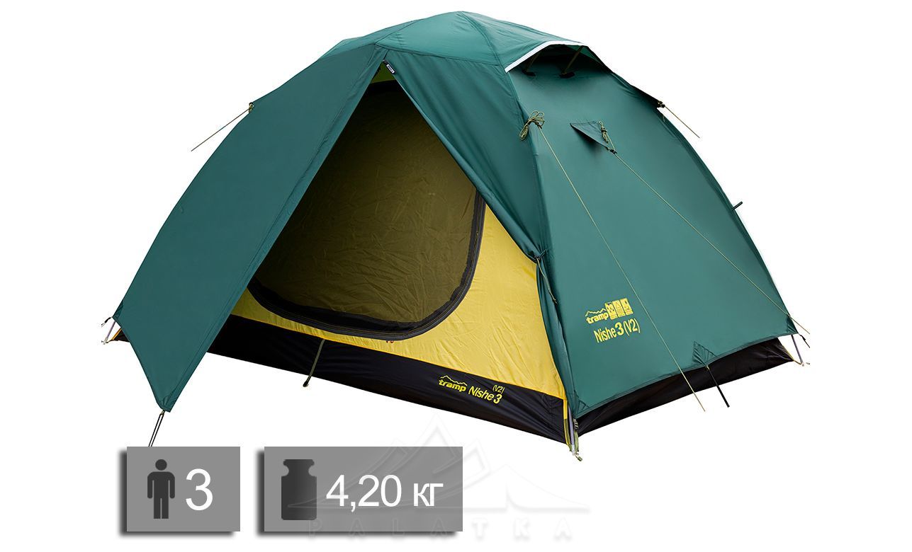 Намет Tramp UTRT-054 Nishe 3 V2 — універсальний 3-місний намет для туристичних походів. Збільшений корисний об'єм тамбура. Простора спальня. Просте та швидке встановлення. Оновлена версія тенту - тепер без жовтих контрастних елементів!