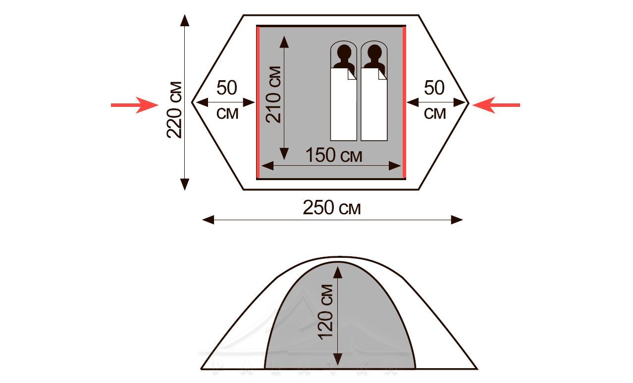 - 2 вентиляційні віконця у зовнішньому тенті зі складними стійками-підпорами