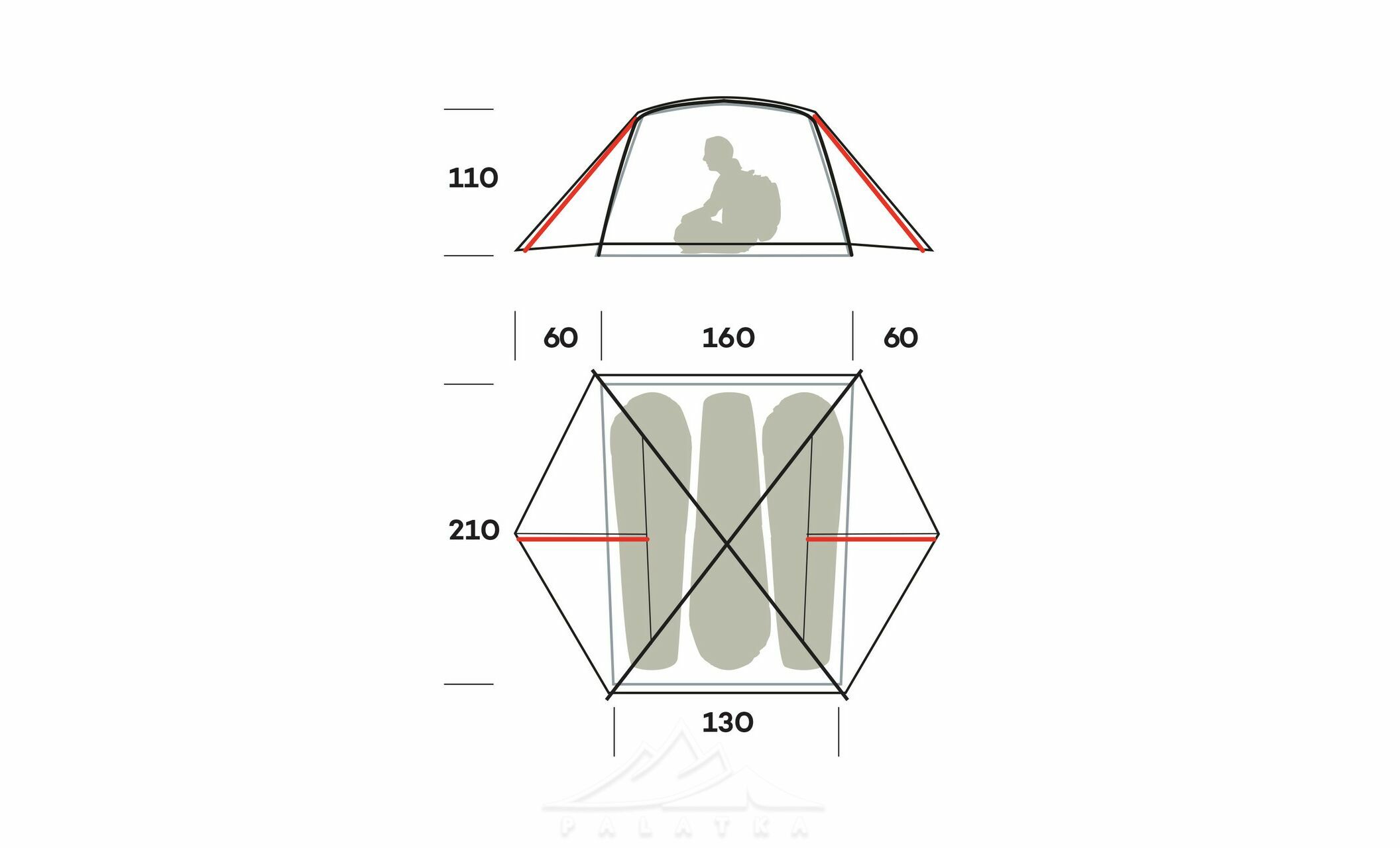 - Конструкція: купол зі зміщеним піком (з 2х дуг) + коротка дуга-розпорка розширюють геометрію з одного боку й додають жорсткості — намет відчутно міцніше стоїть і має кращий корисний об’єм.
